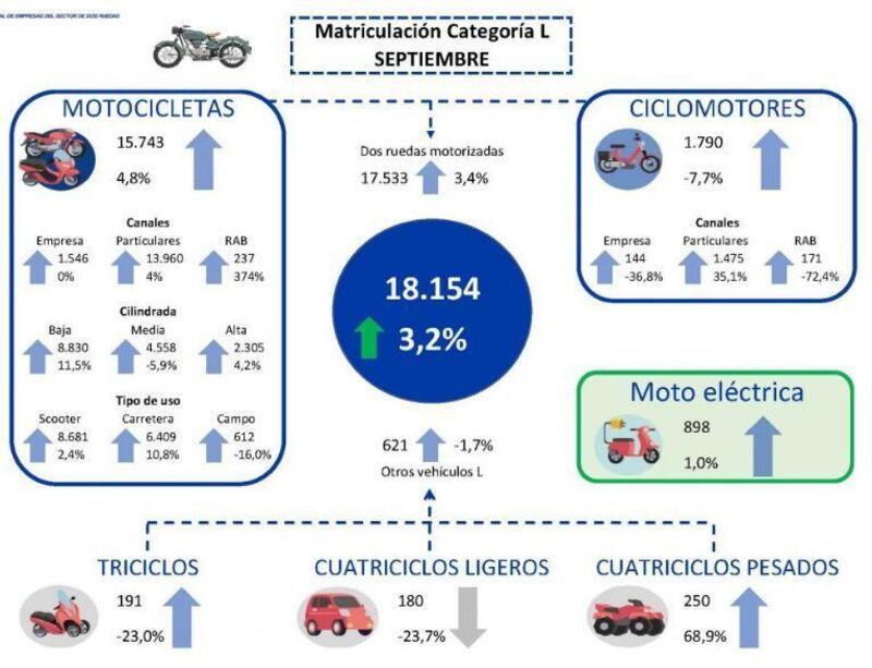 I dati delle immatricolazioni spagnole vedono il mese di settembre a +3,2% sullo stesso mese del 2019. L'Associazione Nazionale Imprese del Settore Due Ruote (Anesdor) comunica che le vendite sono state 17.533, suddivise fra 15.743 motocicli (+4,8%) e 1.790 ciclomotori (-7,7%).