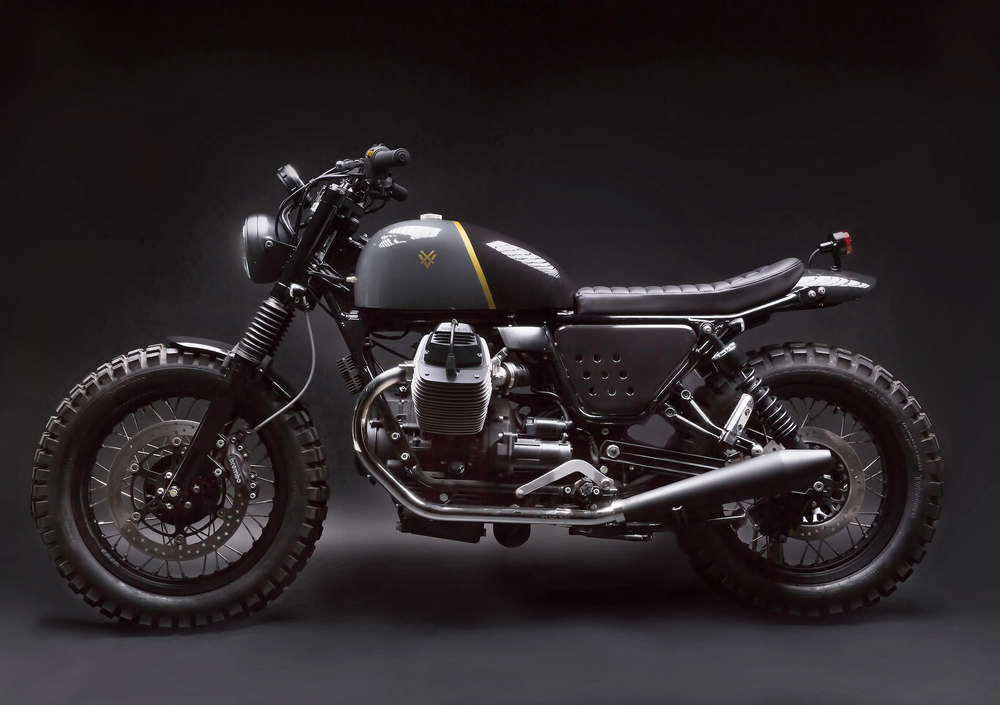 Il serbatoio è quello già visto sulla Tractor V75 (Stefano lo definisce “l’unità ideale per una Moto Guzzi Scrambler”) modificato per accogliere la pompa della benzina. I cerchi vengono da una V7 Racer perché le unità in lega non si accordavano per nulla alla nuova trasformazione i cui colori dominanti sono due diverse tonalità di grigio lucido con una striscia dorata che richiama il logo dello stesso colore, semplice e poco vistosa nella sua eleganza.