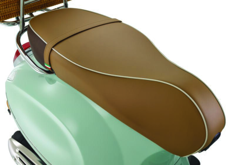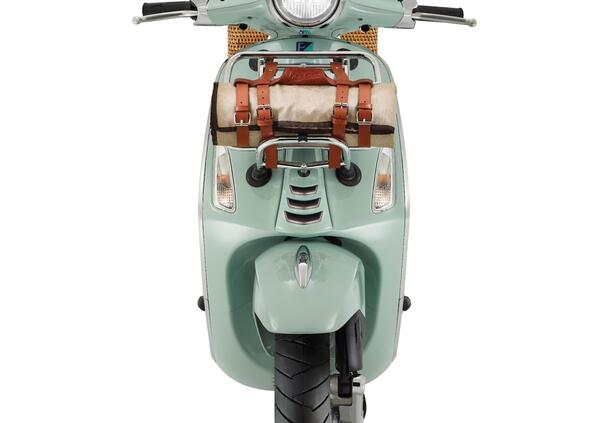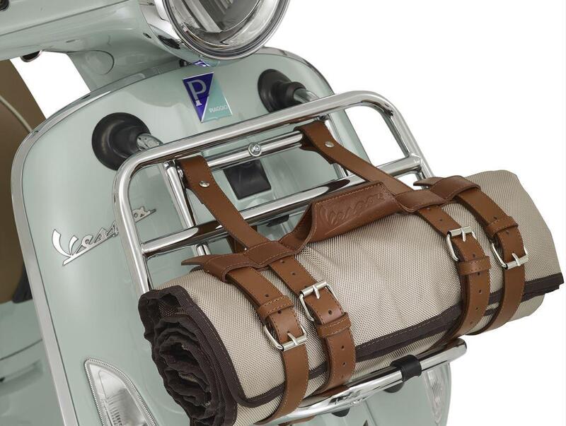 Cestino e telo, con il logo del modello, possono essere trasportati sui portapacchi posteriore e anteriore cromati, che sono di serie su questa versione e sono arricchiti da una cinghia in cuoio marrone che funge anche da manico per trasportare a mano il telo ripiegato.