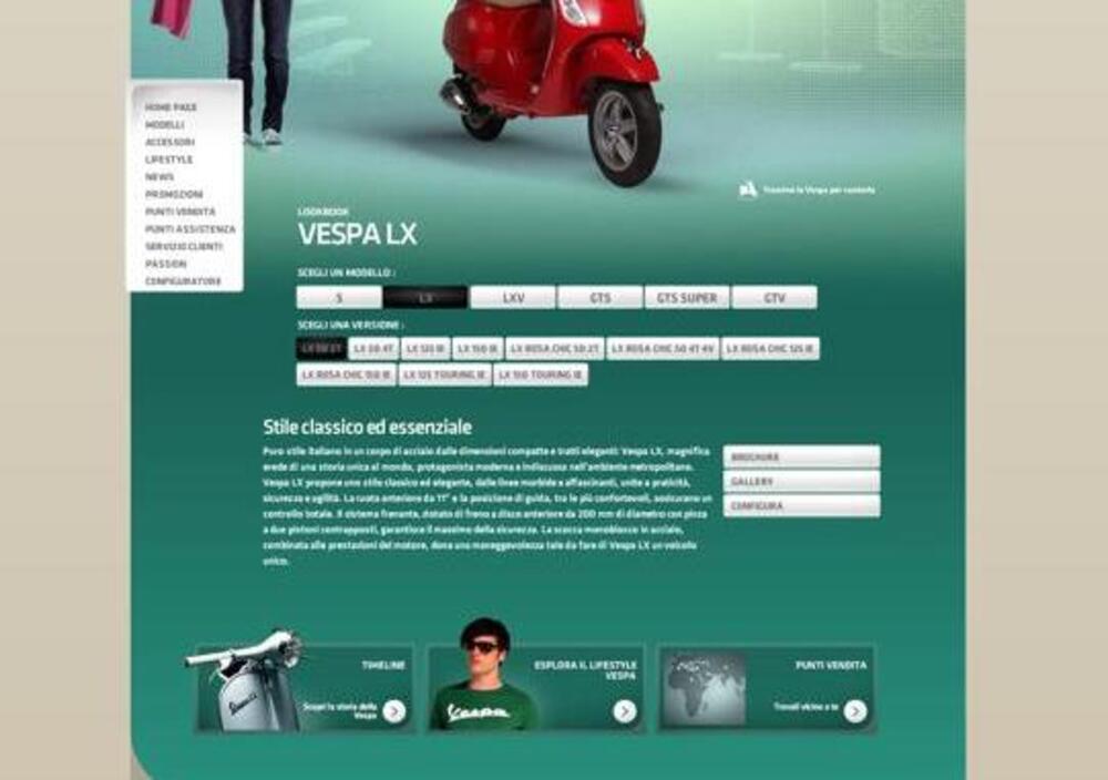 ll sito di Vespa si contraddistingue per un riuscito mix tra tecnologia ed eleganza. E' uno spazio web capace di creare una user experience unica ed emozionale, con una particolare cura per il dettaglio e l'usabilità attraverso la fluidità della piattaforma Flash e la funzionalità del CMS Magnolia. In particolare il codice Flash, mediante l'utilizzo della tecnologia swf address, permette il deep linking di tutte le pagine, mentre l'integrazione tra il CMS e Flash consente un'ottima indicizzazione sui motori di ricerca.
