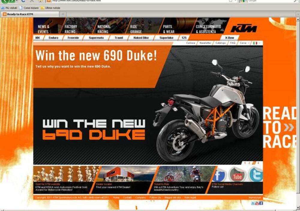 KTM lancia una nuova iniziativa per promuovere la 690 Duke. Attraverso la pagina Facebook KTM Official Fanpage gli appassionati potranno prendere parte al gioco organizzato da KTM dove il premio finale è la nuova KTM 690 Duke.