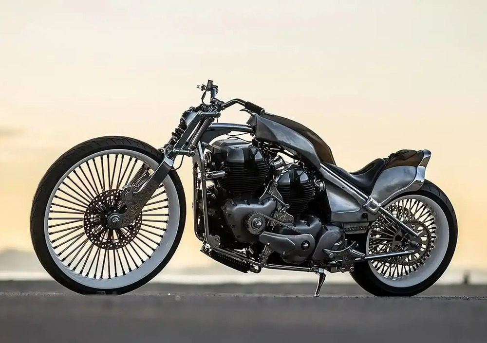 L’elemento che cattura immediatamente l’attenzione e lascia sbalorditi gli appassionati è la scelta propulsiva. Yoshizawa non si è accontentato del generoso bicilindrico della Royal Enfield Classic 650, ma ha deciso di raddoppiare la scommessa accoppiando due di questi motori in tandem. Questa complessa operazione meccanica ha trasformato la moto in una powerhouse a quattro cilindri disposti uno dietro l’altro, richiedendo una serie di importanti modifiche strutturali. Per accorciare il passo e rendere l’insieme armonioso, il motore anteriore è stato privato della scatola del cambio e il carter è stato pesantemente rimaneggiato, permettendo di avvicinarlo il più possibile all'unità posteriore. La sincronizzazione tra i due blocchi, uniti da una catena e da un sofisticato sistema di ingranaggi primari, è gestita da un'unica centralina elettronica che assicura una risposta fluida e coordinata.