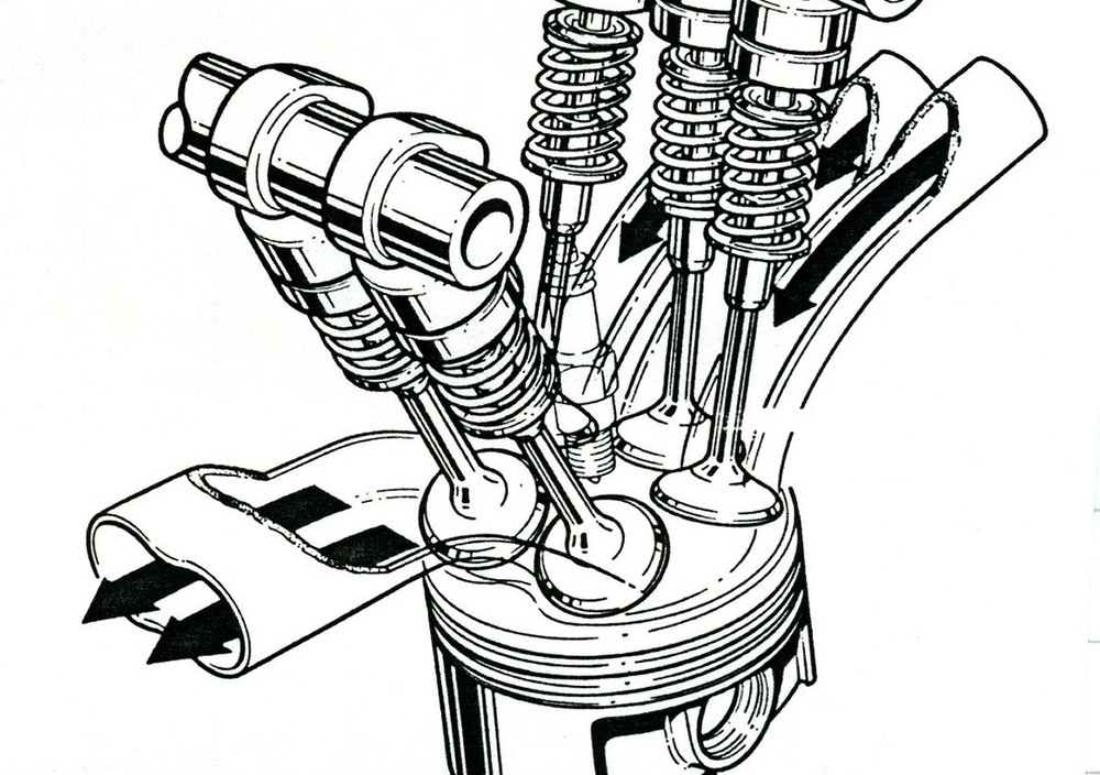 Una soluzione sulla quale, quando è stata lanciata in grande stile dalla Yamaha, molti tecnici hanno puntato con decisione per i loro motori di prestazioni più elevate è quella che prevede l’impiego di cinque valvole per cilindro (tre di aspirazione e due di scarico) al posto delle usuali quattro. In effetti dal punto di vista geometrico ci sono dei vantaggi. Le sezioni di passaggio a disposizione dei gas che entrano nel cilindro sono infatti maggiori. In altre parole, lo spazio disponibile, per ogni dato alesaggio, viene sfruttato meglio. La forma della camera però è meno favorevole, rispetto a quella classica a tetto che si ha impiegando quattro valvole. Il vero problema comunque è un altro. Benché le sezioni siano maggiori, il coefficiente di efflusso è peggiore.