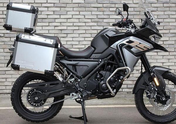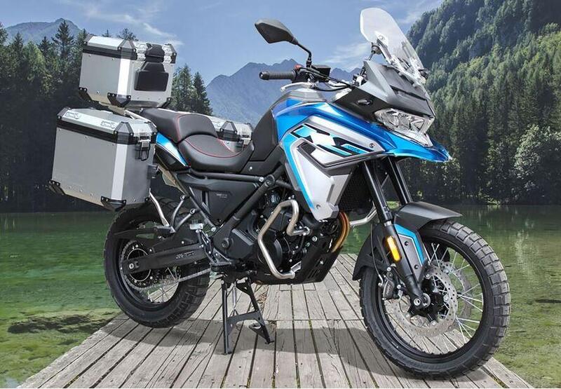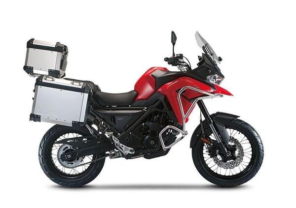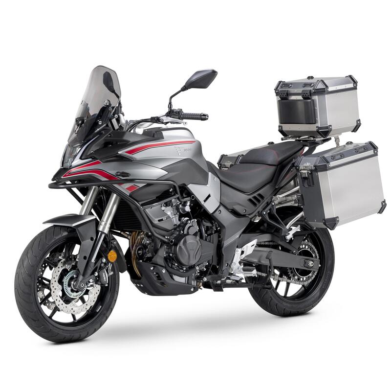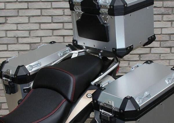 La strumentazione prevede uno schermo TFT con connettività e la dotazione è completata da cavalletto centrale e laterale, selle separate, parabrezza regolabile in altezza, barre protezione motore e coppia di borse più bauletto in alluminio.