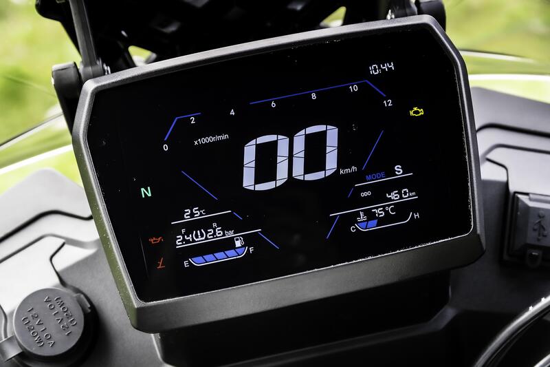 La dotazione vede un display LCD a colori da 7” che, oltre a offrire indicazioni di base come livello del carburante, regolazione data e ora, sensore temperatura esterna, pressione pneumatici integra anche la connettività Bluetooth con lo smartphone, attraverso la quale è possibile attivare mediante l’ App dedicata VOGE GLOBAL anche la funzione di navigazione turn by turn semplificata che replica le indicazioni direttamente sul display. Per evitare che il proprio smartphone si scarichi mentre è attiva la funzione di navigazione sono presenti due prese nella zona del cruscotto, una 12V sulla sinistra e una USB con ricarica rapida sulla destra. A completare la dotazione ci pensano anche i doppi cavalletti laterale e centrale, il cavo antifurto casco nel vano sella, il maniglione passeggero con porta pacchi posteriore integrato, i paramani e le leve al manubrio regolabili nella distanza.