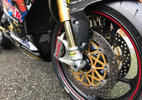 La componentistica adottata per questa Triumph Daytona 675 R è di altissimo livello ed è elencata nell’annuncio: parliamo di un set up del motore che permette di erogare più di 130 cv, sospensioni K-Tech, viteria in titanio, dischi Brembo HPK, sensori Motec, scarico completo Arrow e tanto altro. A completare il pacchetto, inoltre, ci pensano le grafiche di “The Trooper”, marchio di birra prodotta dagli Iron Maiden, con la mascotte “Eddie” e il numero di gara 666. Ovviamente, poi, il cupolino è stato autografato dallo stesso Hickman.