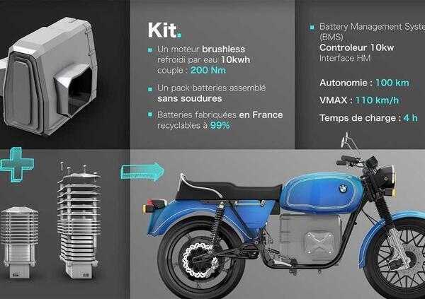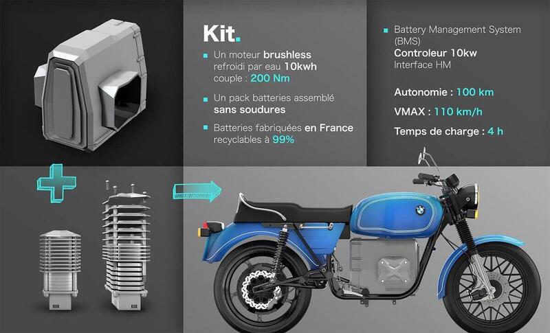 Con il loro retrofit, i due hanno pensato di rivolgersi ai possessori di vecchie BMW serie R, che non sono poche anche in Francia, disegnando un gruppo batterie dal disegno simile al boxer alimentato a benzina.