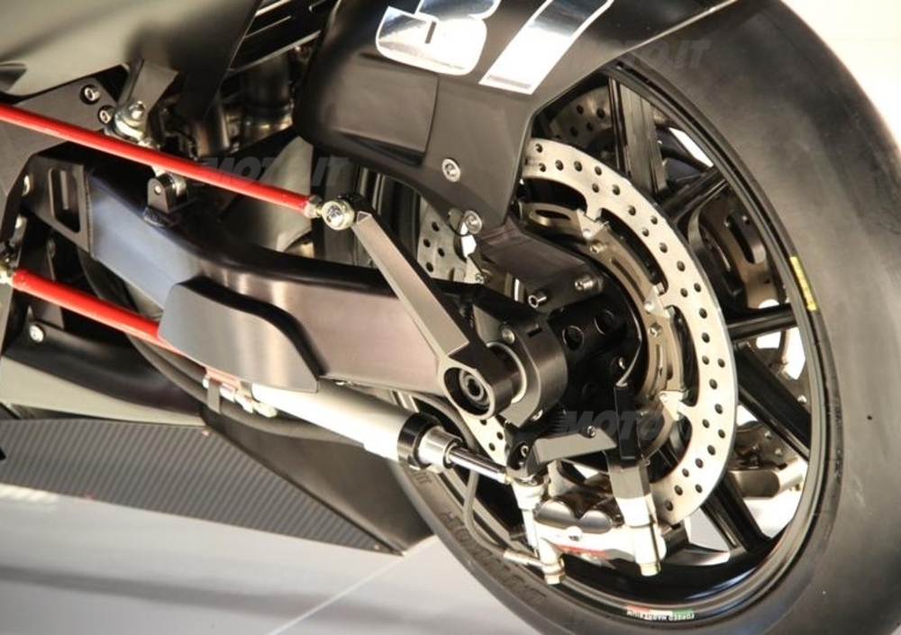Le sospensioni sono collegate con due biellette infulcrate al forcellone che comandano due bilancieri in alluminio che ne regolano la progressione. Ognuna delle biellette spinge in egual modo il bilanciere. Il tutto permette di utilizzare componenti molto contenuti nelle misure e nelle dimensioni con un notevole risparmio di peso e energie. I bilancieri si possono sostituire molto velocemente per mutarne la progressione e le biellette permettono regolazioni di assetto ultraveloci per ottimizzare le prestazioni. Il meccanismo distribuisce le forze in parti uguali sui due bracci e in maniera simmetrica annullando le torsioni tipiche degli organi in movimento nei normali motocicli; da ciò ne deriva che anche il peso e le dimensioni dei focelloni stessi sono ridotte in maniera rilevante.