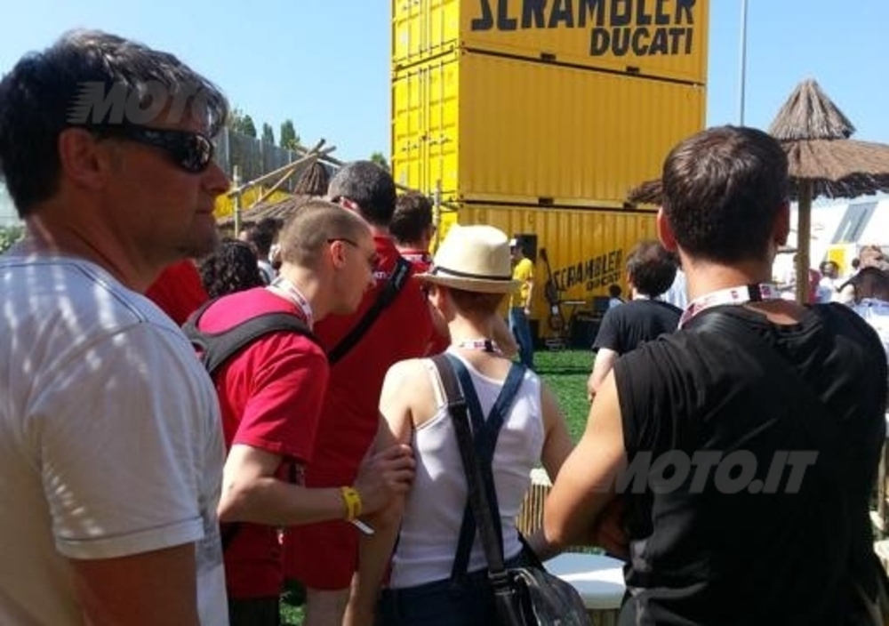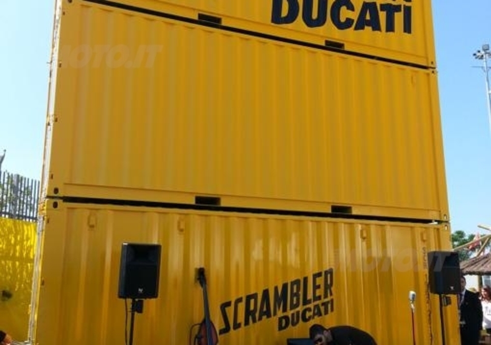Nel container (non più di 8 persone alla volta all'interno) la moto è coperta dal classico telo rosso, e un video racconta la storia del mito dal 1962 ad oggi. E poi ecco che, finalmente, la Scrambler si svela agli occhi dei privilegiati presenti. I commenti del pubblico che abbiamo raccolto a caldo sono positivi: gli appassionati di vecchia data rivedono con piacere le linee della mitica moto degli anni '60, i più giovani parlano delle possibili modifiche e personalizzazioni.