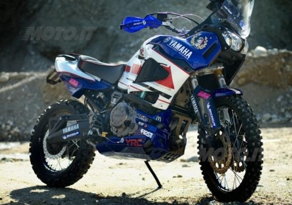 L'altra moto, quella a base blu, è la XT1200Z rivista più in profondità e destinata ai rally. Posteriormente la moto è stata accorciata di 180 mm riducendo il telaietto e ridisegnando la coda che ora è in fibra di carbonio e accoglie il serbatoio per l'acqua potabile. L'originale serbatoio della benzina è stato modificato negli appoggio delle ginocchia, perdendo un litro di capacità ma guadagnando in ergonomia nella guida off-road. Importante il passaggio ai cerchi, Excel, da 21 e 18 pollici per poter montare i pneumatici specifici, nel caso i Michelin Desert. Naturalmente sono state riviste le sospensioni, la forcella originale è stata modificata internamente da Andreani e il mono posteriore è un Ohlins specialistico. Il forcellone originale è stato rivisto unicamente per il montaggio del cerchio e della relativa gomma da 18 pollici.
