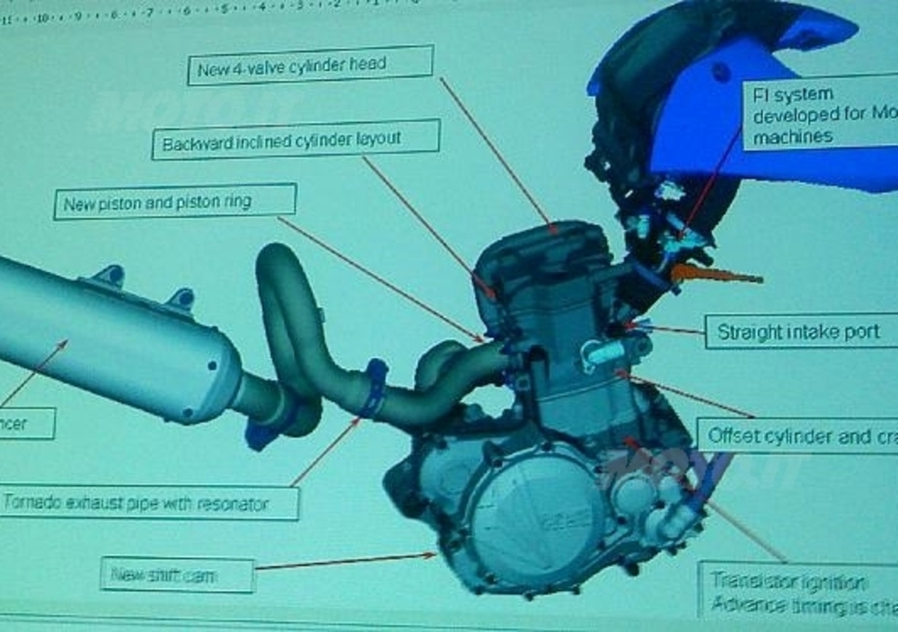 Un migliore accentramento delle masse è reso possibile dalla nuova inclinazione del cilindro, ruotato di circa 10° verso il posteriore della moto.