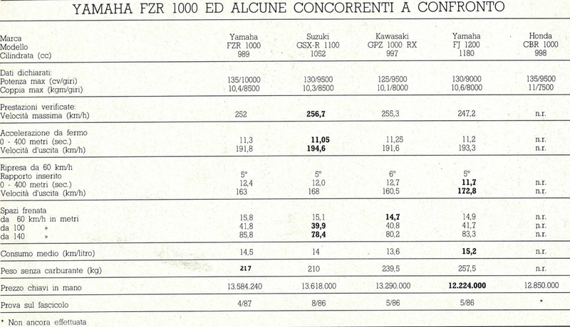 All'esame pratico, vale a dire quello imposto dai nostri rilevamenti strumentali, la nuova 1000 della Casa di Iwata non ha battuto record di categoria, alcuni dei quali per ora ancora appannaggio, per quanto ci riguarda, della Suzuki GSX-R: la quale, lo rammentiamo, conta però su una cilindrata maggiore di 63 cc ed un'erogazione della potenza senz'altro più favorevole al raggiungimento di tempi record, specialmente per quanto riguarda l'accelerazione da 60 km/h nel rapporto più lungo. E ancora meglio, in questo caso, si era comportata la stessa Yamaha FJ 1200, grazie al suo massiccio motorone da 1.188 cc (che, non scordiamolo, vanta ben 130 cv dichiarati e, soprattutto, 11 kgm di coppia a 7.500 giri!) mette a disposizione nel primo arco della curva di utilizzazione, unitamente ad una quinta marcia piuttosto corta. Anche gli 11,3 secondi impiegati per coprire i 400 metri da fermo (sempre, rammentiamo, con-siderando la presenza della nostra ruota Peiseler e relativi attacchi e strumentazione) sono da considerarsi una buona prestazione: in questo caso dobbiamo anche tener conto della lunghezza della prima marcia, unitamente ai già accennati segni di affaticamento da parte della frizione, duramente sollecitata durante i nostri test.