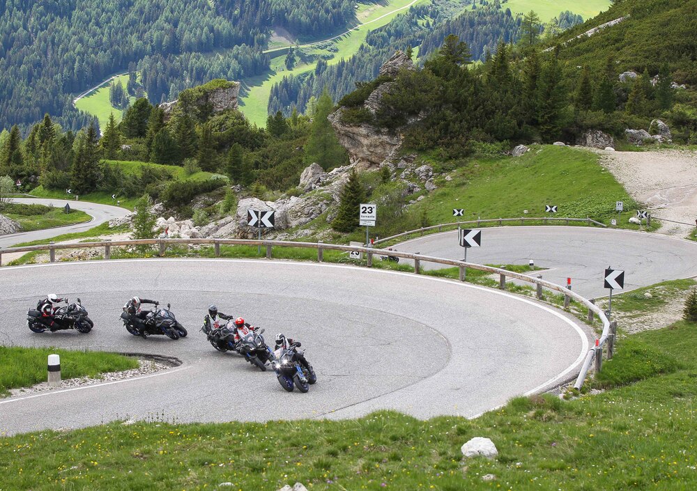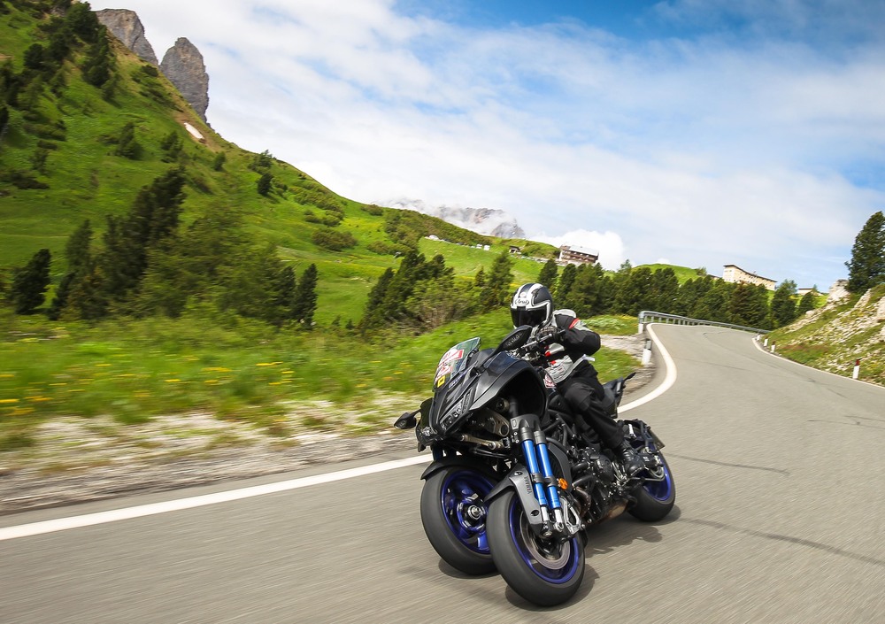 Finalmente arriviamo alla scalata dei leggendari passi Sella e Gardena prima, Falzarego, Giau e Pordoi poi. La Niken qui si mostra per quello che è: un mezzo innovativo dotato di tenuta di strada e frenata fenomenali. Incontriamo i primi tratti in salita di asfalto bagnato. Qui la Yamaha infonde una sicurezza micidiale: l'avantreno non molla mai ed è pure agilissimo nei cambi di direzione. Soffre di più il posteriore che, complice una gomma un po' stanca, si lascia andare a una serie interminabile di derapate, sempre gestibili grazie al traction control inserito.