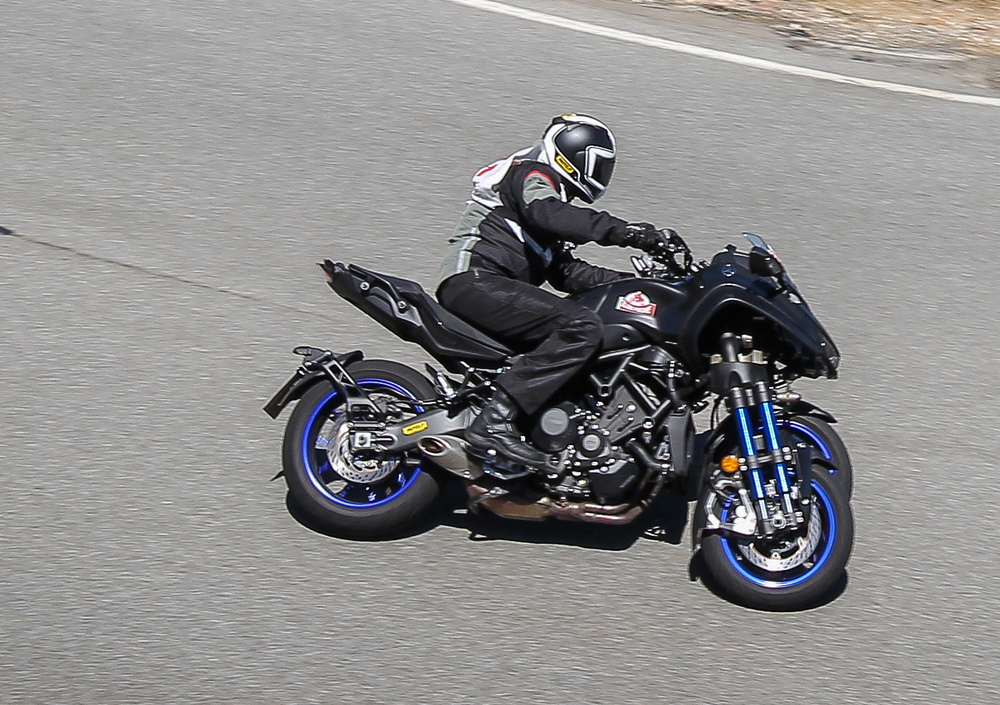 L'altro aspetto degno di nota è la frenata, che può essere portata fino a centro curva senza che la Niken soffra il classico effetto auto-raddrizzante. La doppia forcella lavora molto bene anche sui dossi, mentre il mono è piuttosto brusco sullo sconnesso.