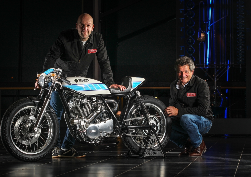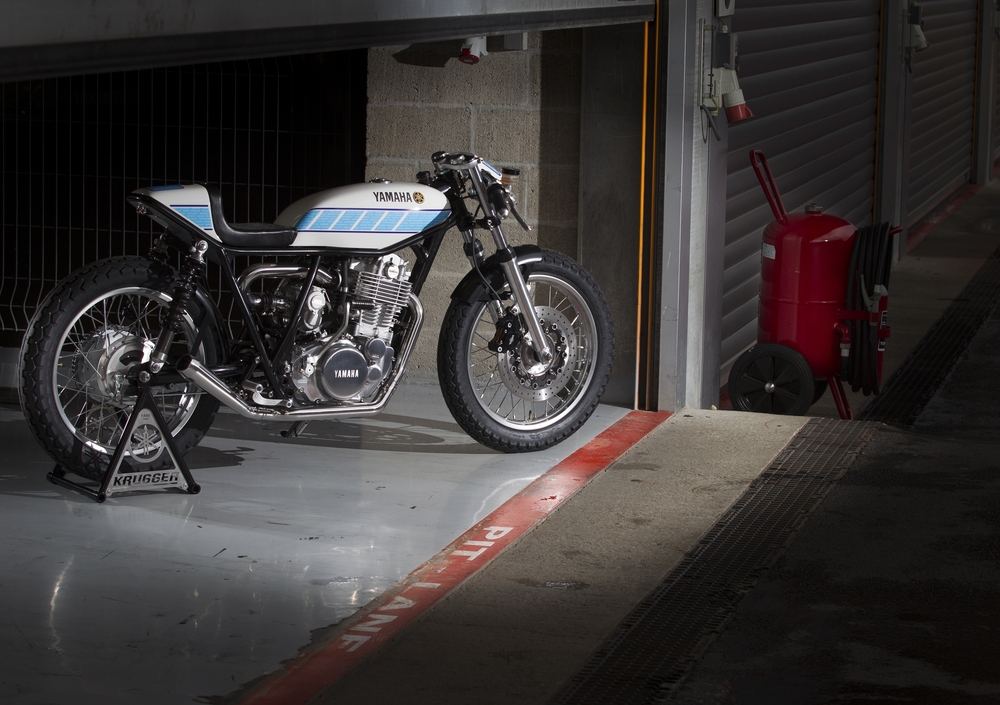 La scelta è ricaduta sulla SR 400 per la sua essenzialità che la avvicina idealmente, non certo nella meccanica o nella ciclistica, alle prime Yamaha TZ da GP sulle quali Bernard ha lavorato. Rispetto a quello di serie il serbatoio è più stretto, allungato e rastremato anteriormente per appoggiarsi anche visivamente sul modificato telaio. Codino e mini cupolino sono pezzi unici, mentre la verniciatura speed block è nei colori bianco azzurro delle Yamaha schierate dall'importatore francese Sonauto, con le cromatiche dello sponsor Gauloise dell'epoca riprese dai pacchetti di sigarette Gauloise Caporal. La grafica azzurra sul serbatoio riporta i nomi dei tanti piloti che hanno vinto con Yamaha ai tempi di Bernard, compreso Mick Doohan che con Yamaha corse in Australia prima di diventare campione del mondo con i colori Honda.