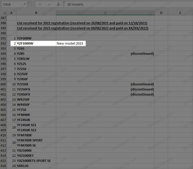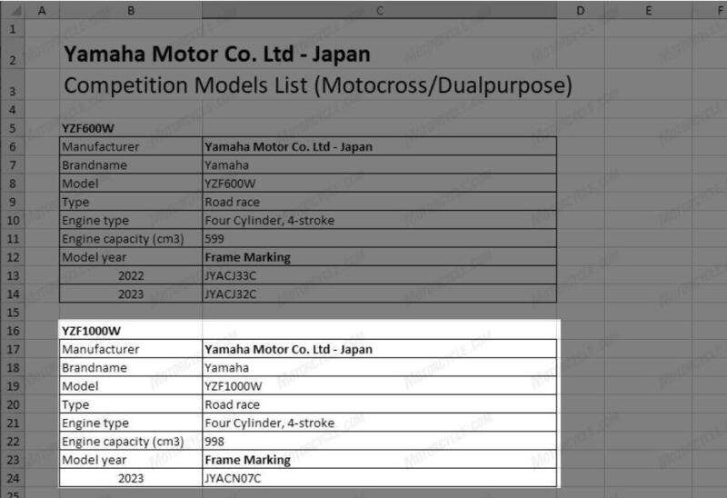 Ci sono alte probabilità che Yamaha si appresti a lanciare una YZF-R1 uso pista come model year 2023. Lo suggerisce un elenco della Federazione Motociclistica Internazionale che riguarda i modelli approvati per le competizioni e che vede una inedita YZF1000W registrata lo scorso 9 giugno.