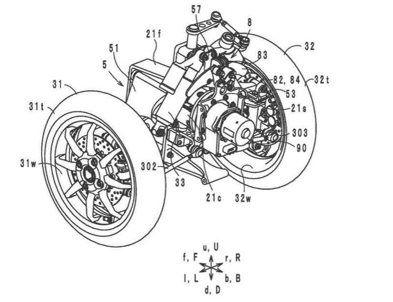 Un altro elemento interessante, e inedito, è un attuatore elettrico montato alle spalle della sospensione anteriore (disegno qui sopra) che potrebbe fungere da controllo della stabilità, mentre un terzo freno a disco coassiale all'attuatore dovrebbe servire a mantenere il veicolo in posizione verticale durante le soste.
