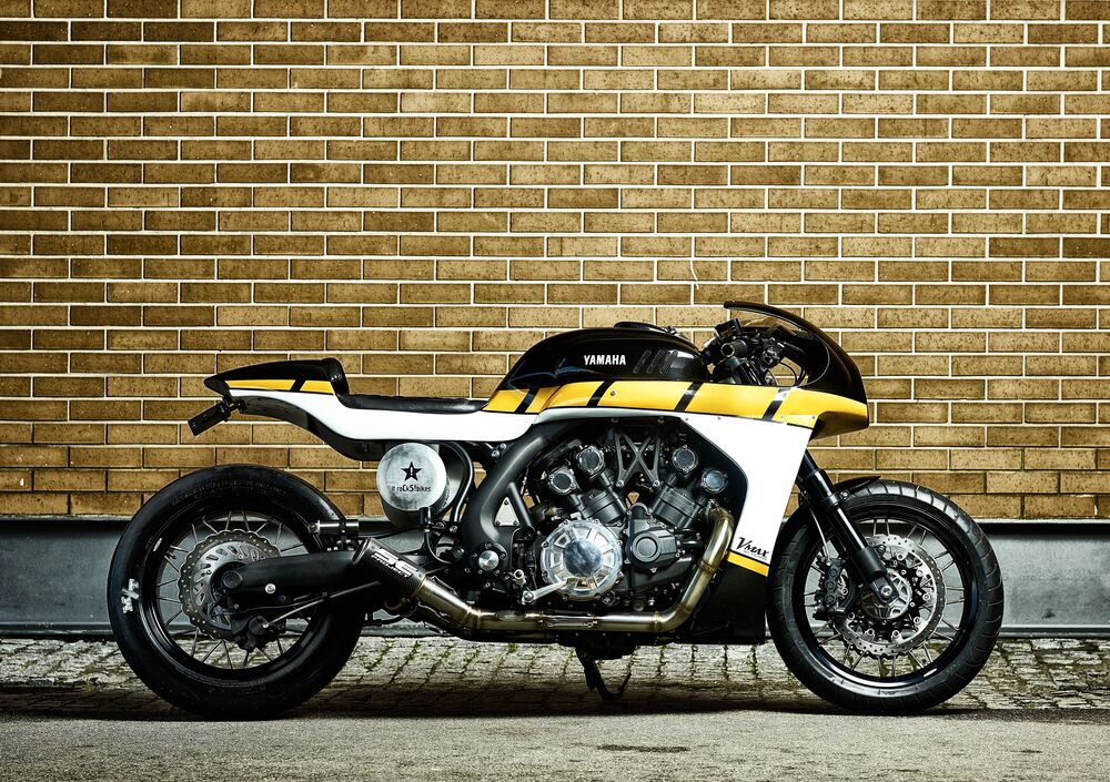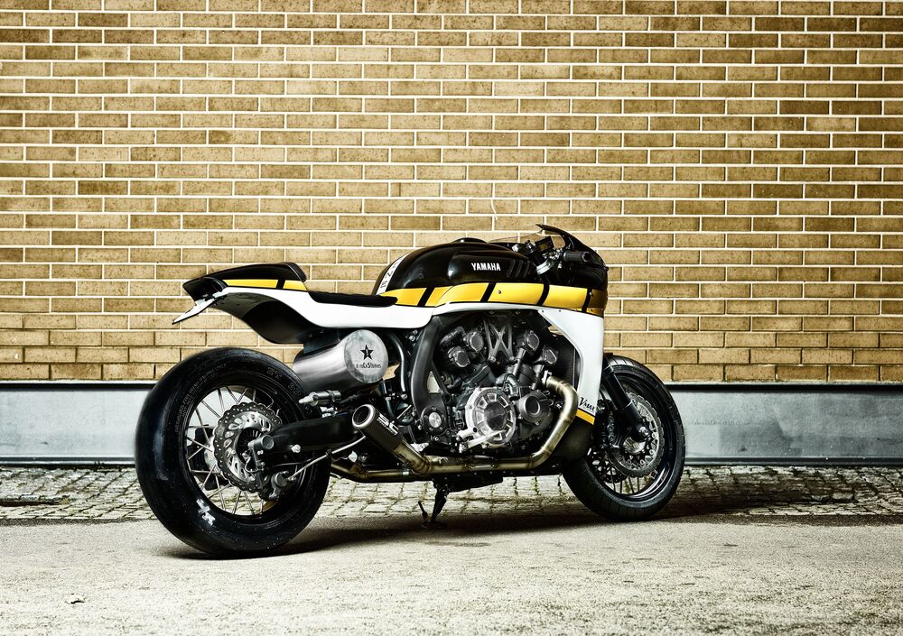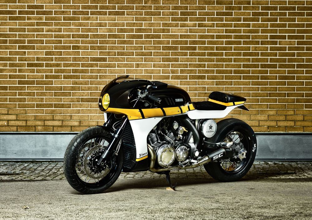 La colorazione è nello stile Yamaha 60°, ovvero il noto speed block giallo nero delle Yamaha da gara americane. Cambia totalmente l'impostazione di guida della VMAX, che così interpretata dà un assetto allungato sui semi manubri e non più a impugnare il manubrio largo e alto. Risaltano la gomma slick posteriore Mickey Thompson e i collettori 4 in 2 che confluiscono nello scarico custom SC Project con silenziatore in carbonio.Le ruote a raggi sono artigianali, mentre il contagiri originale è stato mantenuto, ma ne è stato cambiato l'alloggiamento, ora in alluminio. Gli adattatori e i supporti per le pedane LSL, invece, consentono al pilota di assumere una posizione di guida sportiva. Troviamo inoltre il tappo carburante Rizoma e il filtro dell'aria K&N, i freni e la pompa della frizione Brembo, numerosi componenti Motogadget (manopole, comando m-switch, frecce m-blaze) e la sella di cuoio cucita a mano.
