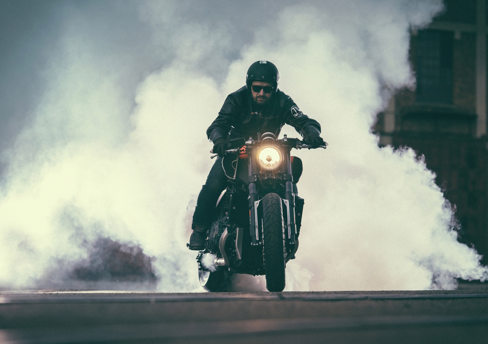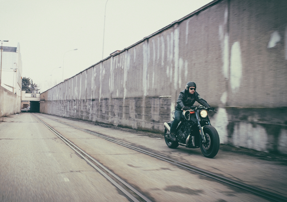 Profondamente legato all’estetica JvB-moto il frontale, con il gruppo ottico inserito ed integrato fra forcella e piastre di sterzo; il manubrio strettissimo fa molto café racer ed è la giusta cornice per il contagiri Autometer (componente classico di questo tipo di special) anche se difficilmente migliorerà la guidabilità. D’altra parte già la scelta della gommatura lascia intuire un mezzo ispirato alle gare d’accelerazione piuttosto che alle sfide sul misto stretto…