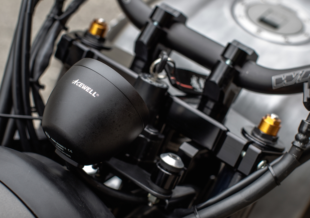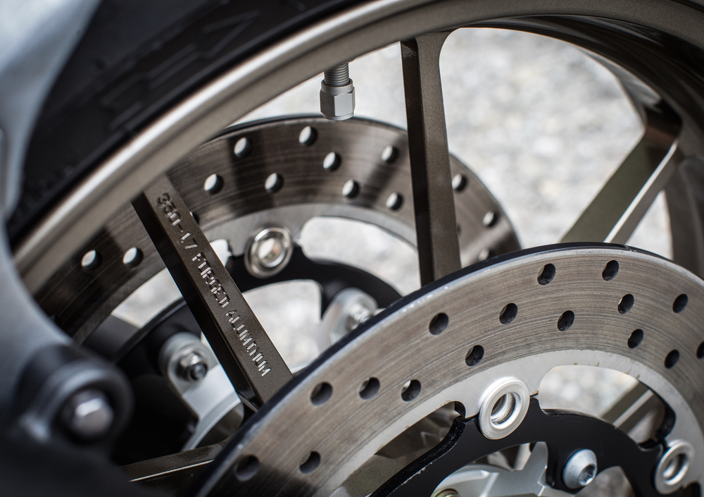 All’avantreno impianto frenante completo e forcella sono stati sostituiti da unità prelevate da un modello 2014, con trattamento TiN degli steli a colorazione nera. Le piastre di sterzo sono unità in alluminio ricavate dal pieno anodizzate nello stesso colore realizzate da Racingpartsclassic, con comandi al manubrio (comprese pompe dei comandi freno e frizione) nuovi, contrappesi manubrio Lightech e manubrio stesso anodizzato nero a sezione variabile sul quale spicca la strumentazione Acewell ACE 4XXX.