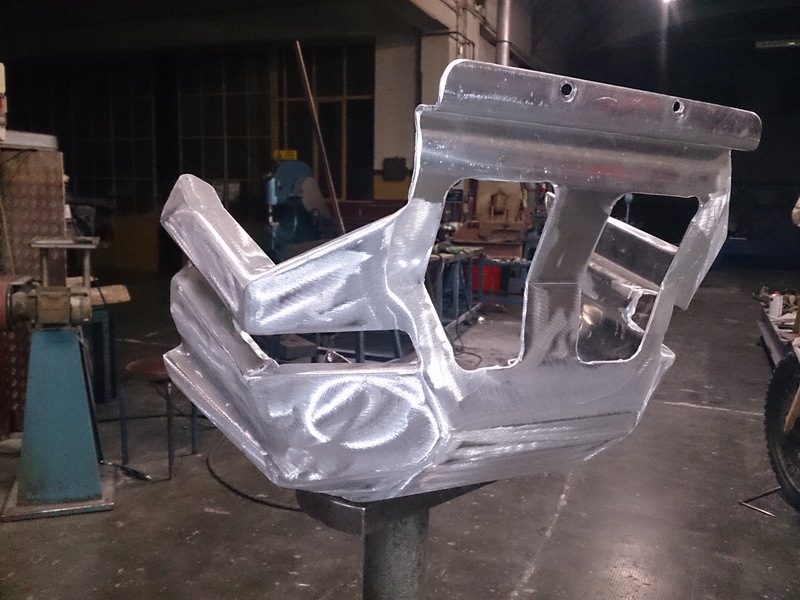 La monocarena era pressoché fatta ora potevamo dedicarci al parafango anteriore; il minatore bovesano aveva le idee chiare e in pochi minuti trovò la soluzione migliore. Mantenendo la linea dell'originale, accorciare la parte posteriore di alcuni centimetri creando nella parte anteriore un punto di giunzione tra parafango e parasteli con una apertura a goccia, in puro stile racing.