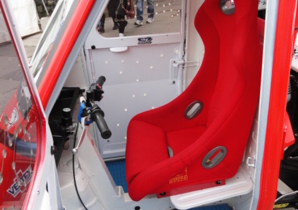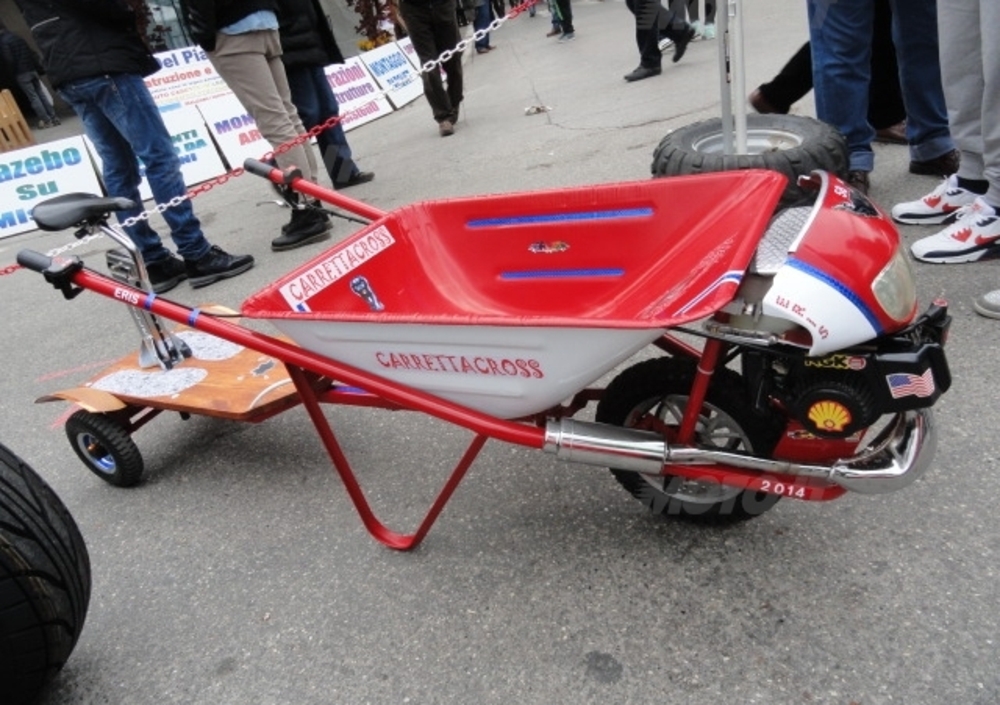 L'altro progetto, la Motocarretta, nasce dal montaggio di un motore da minimoto su - appunto - una carriola, capace anche lei di prestazioni ben superiori a quelle per cui l'ingegno umano l'aveva inizialmente creata. La ruota anteriore, montata su uniball, è sia motrice che direzionale, e Mauro (il titolare di MotoNova) può guidare quindi la Motocarretta effettuando 360° e svolte strette. Le prestazioni? Si parla di oltre 70 all'ora, ma con le parole dello stesso autore, la stabilità oltre i 30 all'ora si fa quantomeno precaria...