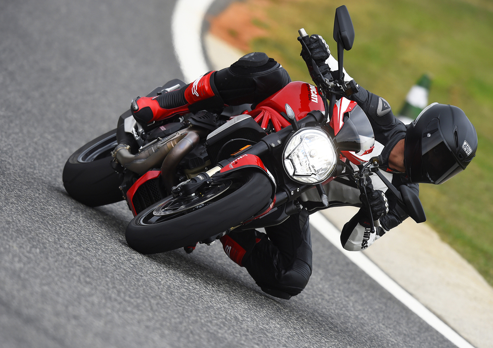 Sorriso ebete. È quello che probabilmente abbiamo sotto la visiera scura del nostro casco, dopo il primo giro del tortuoso Ascari Circuit. In sella al Monster 1200 R ci si trova a proprio agio nel giro di poche curve, e la confidenza che trasmette ė sconosciuta a tutte le precedenti versioni "anabolizzate" della nuda bolognese. Confidenza che si guadagna prima di tutto grazie a una posizione in sella che permette di muoversi a piacimento, anche in senso longitudinale, con spazio anche per muovere gli stivali sulle pedane (chi ha guidato una Monster sa di che cosa parliamo), senza che il terminale di scarico o il supporto pedana passeggero interferiscano. La libertà di movimento permette di caricare o alleggerire l'avantreno a piacimento, e di accompagnare la discesa in piega e i cambi di direzione in maniera sconosciuta alle altre Monster, che soffrivano, per la posizione di guida piuttosto infossata, e anche rispetto alla 1200 S che ha la sella più scavata. I 15 mm di altezza in più, merito dell'assetto e non del piano di seduta rialzata, rendono la guida della 1200 R più rapida e svelta rispetto alla 1200 che conosciamo, anche a dispetto del gommone da 200 posteriore. Il merito va anche ascritto ai cerchi forgiati in alluminio più leggeri, che diminuiscono l'inerzia, e probabilmente al telaietto posteriore più rastremato e anch'esso più leggero.