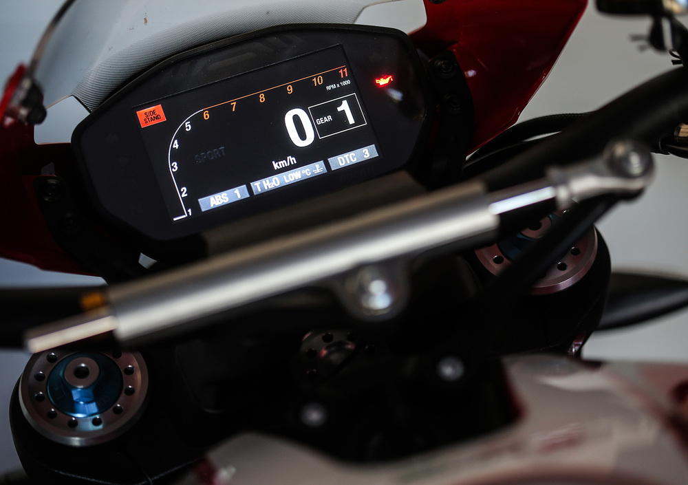La Ducati Monster 1200 R è equipaggiata con il DSP (Ducati SafetyPack), che comprende oltre all'ABS regolabile, il DTC (Ducati Traction Control) che agisce sull'anticipo dell'accensione, risultando molto progressivo e lineare nell'intervento, e si può regolare su 8 differenti livelli, qualunque sia il Riding Mode selezionato. Riding Mode del bicilindrico che permettono di scegliere fra tre modalità di guida differenti, con settaggi predefiniti di ABS e DTC. Attraverso un comodo pulsante sul blocchetto sinistro si possono selezionare, anche in movimento ma a gas chiuso, le modalità Urban, Touring e Sport. La prima limita la potenza a 100 cv e prevede il DTC su livello 6 e ABS su livello 3. Potenza massima ma con risposta del gas differente per Touring e Sport, con DTC e ABS regolati rispettivamente su 4/2 per la prima, e 3/1 per la seconda. Nel caso in cui si selezioni la modalità Sport, cambia anche la schermata della strumentazione (definita Track), che mette in evidenza le informazioni finalizzate alla guida sportiva. Selezionando la modalità Urban, le informazioni visualizzate diminuiscono, sparisce per esempio il contagiri, mentre si ingrandisce l'indicatore della velocità. In Touring si ha invece la schermata più completa e utile durante i viaggi.