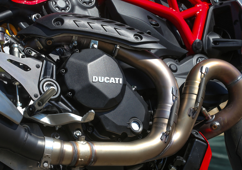 La Monster 1200 R monta una nuova versione del Testastretta11°DS da 1198 cc, che vede salire la potenza massima a 160 cv a 9.250 giri/min, quindi una quindicina in più rispetto a quello che equipaggia la versione “S”. La coppia massima é 13,4 kgm a 7.750 giri/min, circa 500 giri più alta della versione meno potente (a 3.500 giri è già disponibile il 75% della coppia), mentre il rapporto di compressione sale da 12.5:1 a 13:1 grazie a una nuova guarnizione dei cilindri più bassa. Le modifiche principali hanno riguardato l'impianto di scarico con collettori da 58 mm di diametro (+8 mm) e un terminale di scarico inedito di maggior volume. A far respirare a dovere il bicilindrico ci pensa un corpo farfallato ovale, che prende il posto di quelli circolari da 53 mm, con un diametro equivalente di 56 mm. Il cambio è a sei rapporti, con frizione antisaltellamento azionata da una pompa radiale Brembo, quest'ultima mantiene il sistema di asservimento progressivo, molto apprezzato in quanto alleggerisce lo sforzo di azionamento. Anche gli interventi di manutenzione rimangono gli stessi delle versioni meno potenti, con intervalli di manutenzione ogni 15.000 chilometri o 12 mesi, e la regolazione del gioco valvole ogni 30.000 chilometri.