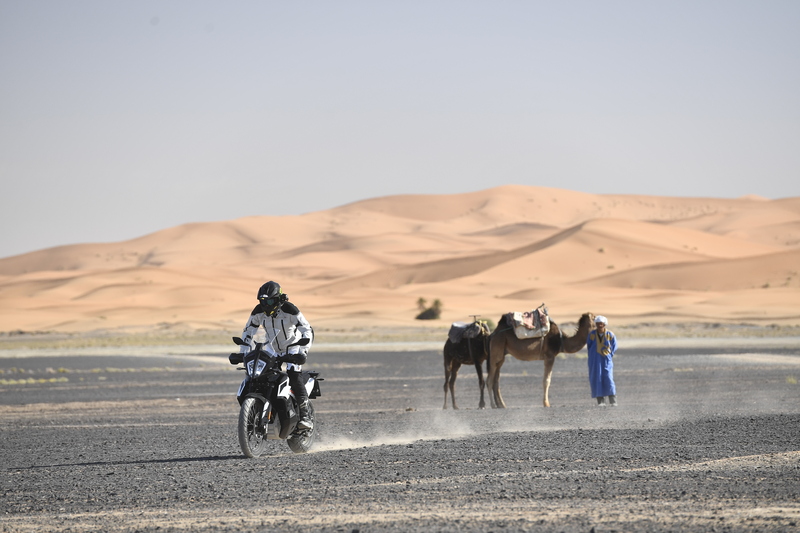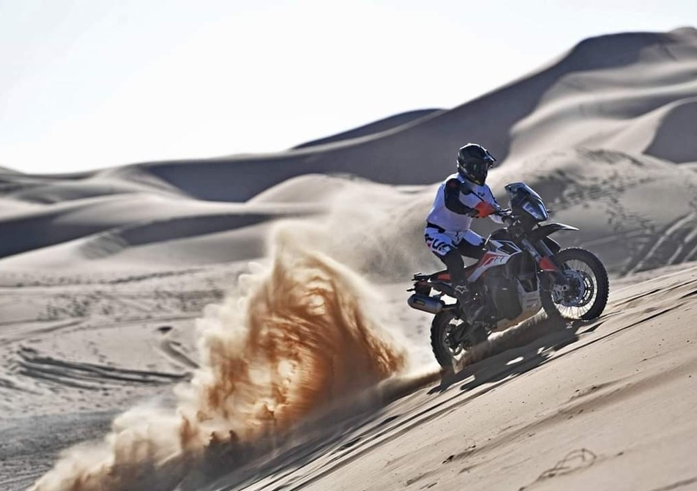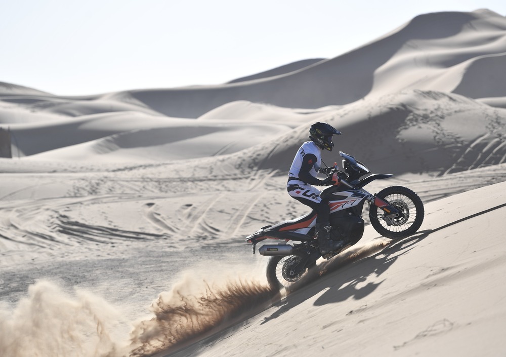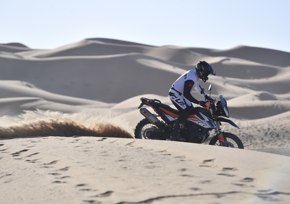 La KTM 790 Adventure R ha lo stesso motore gajardo della standard, zero protezione dall'aria e una sella più scomoda (a ben 88 cm). In più presenta il riding mode rally, che dà una risposta pronta del motore e un comodissimo sistema di controllo del livello del traction control. In sella si sta bene, c'è proprio una posizione da enduro, con un bel controllo. Iniziamo a fare il fuoristrada vero, duro con piste velocissime, ma molto insidiose. Si respira l'adrenalina e il profumo dell'estremo. Siamo sulle piste del Merzouga Rally. Si viaggia fissi a 80/90 orari, con punte oltre i 150 e l'occhio fisso sull'orizzonte. Bisogna intercettare come falchi i sassi, i cespugli e i terribili torrenti in secca. E' qui che emerge l'incredibile efficacia delle sospensioni della R. Forcella e mono incassano tutto, ma proprio tutto. Salti, dossi e cunette non scompongono la moto. Maxienduro da viaggio? No signori, qui sembra di guidare proprio una moto da rally con la bellezza di 94 cavalli. E' la potenza della mitica LC8 950, ma qui è ancora tutto più facile. Il serbatoio basso non deve spaventarvi. E' ben protetto e regge urti di tutto rispetto. Come spiego nel video, l'ho testato per voi e ha retto, mentre il casco in carbonio e la gopro sono andati distrutti. Ovviamente scherzo, non sono - ancora - così scemo da buttarmi per terra apposta in moto. Però la caduta importante c'è stata: dopo chilometri di velocissime dune e piste fatti ad alta velocità senza problemi, mi sono rilassato - e distratto - durante la sessione fotografica su una facilissima duna e... sbaaam! La moto non si è fatta nulla, a differenza del tester, che ha avuto un blackout di diversi minuti. Amici, teniamo sempre la concentrazione al massimo in moto, anche quando ci sembra di affrontare situazioni innocue.