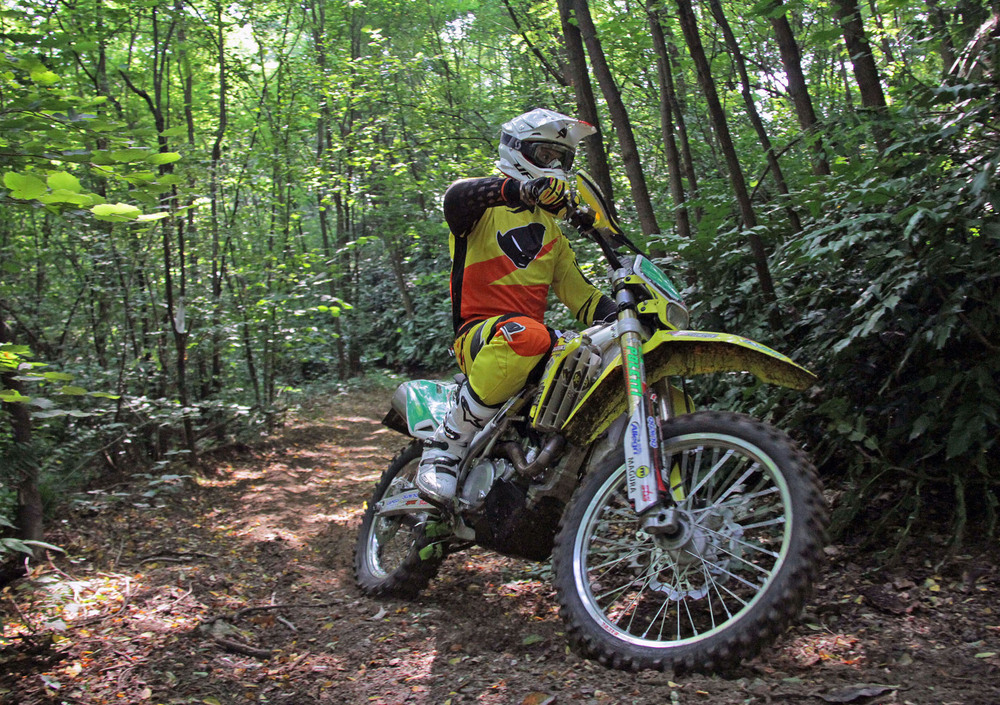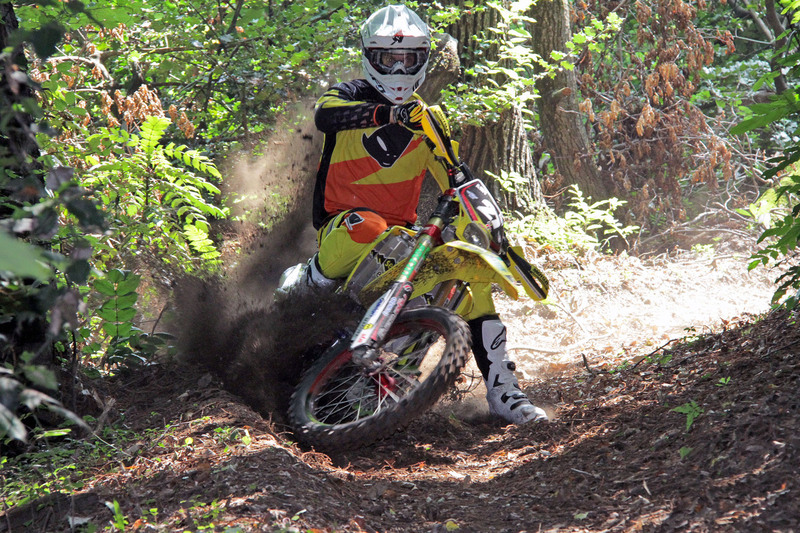 Dal punto di vista ciclistico, è notevole il risultato che è stato raggiunto. Pur essendo una derivata cross e quindi per nulla specifica per la guida enduristica, la Suzuki 250 Rigo risulta ben bilanciata, ha grandi doti di stabilità nel veloce e la giusta maneggevolezza nel guidato. La forcella lavora in maniera delicata e sensibile, con una prima fase di escursione morbida e libera, ma, allo stesso tempo, all’aumentare della velocità e delle asperità, corrisponde un progressivo indurimento per dare il giusto sostegno dove serve. Internamente troviamo il TPS Poletti e molle da 0,46 k con taratura rivista radicalmente. Il mono è caratterizzato da un setting dedicato con una molla da 5,8 k che fa stare la moto un po seduta, a tutto vantaggio della stabilità sul veloce.
