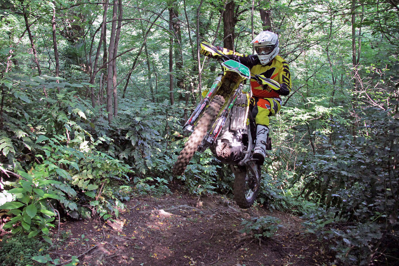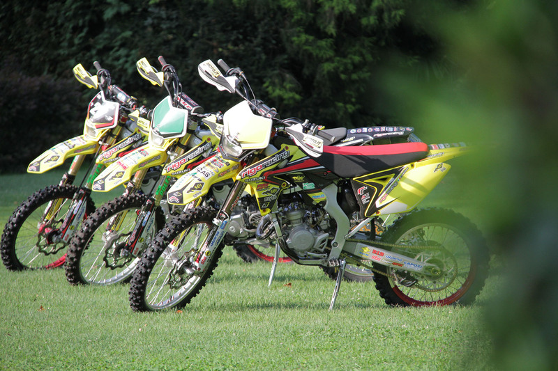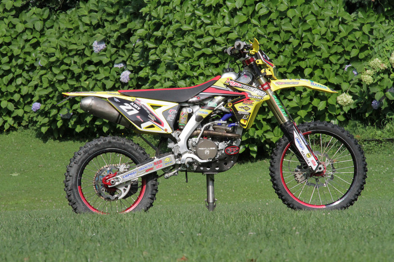 450 4T: La sorella maggiore della 250, pur avendo a bordo una dose massiccia di cavalli in più, si conferma essere della medesima pasta. Anzi, grazie alla cavalleria superiore, si può permettere di mostrare un carattere ancora più dolce e mansueto. Della versione cross non rimane molto, se non la grande dote di stabilità che trasmette il telaio in alluminio nei tratti più veloci ed impegnativi. Dal punto di vista di componentistiche, la 450 riceve il medesimo upgrade della 250 ovvero: disco freno anteriore maggiorato a 270 mm con flangia, scarico Akrapovic modificato internamente, pistone Vertex GP Racer Choice, numerosi interventi di fino agli interni del motore (supporto ingranaggi camme, sedi valvole ecc..), cruna catena e bulloneria Geco, corona SuperSprox e tubi freno Allegri che le danno un tocco ancora più particolare e raffinato.