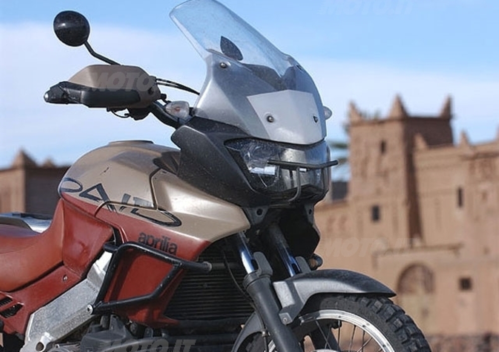 Anche il reparto freni ha subito delle modifiche specifiche per l’uso fuoristradistico. Ecco allora che i dischi anteriori da 300 mm ora sono flottanti, come flottanti sono le pinze a doppio pistoncino.L’Aprilia Caponord Rally Raid viene venduta con pneumatici adatti all’uso stradale, ma compresi nel prezzo ci sono anche una coppia di pneumatici tassellati per l’utilizzo su terreni sterrati.La posizione di guida ha subito un notevole cambiamento, considerando l’aumento dell’altezza da terra della sella (ora pari a 860 mm) che ha mutato anche il profilo della seduta. Pur rimanendo divisa in due pezzi ora, la porzione del pilota risulta meglio raccordata con quella del passeggero (che si può togliere facilmente per lasciare spazio ad un piano di carico). Il manubrio è in alluminio anodizzato con bracci a sezione biconica, estremamente resistente. Le pedane presentano un rivestimento in gomma che si può rimuovere, per migliorare il grip, qualora si dovessero utilizzare stivali da cross.La strumentazione, è costituita da due apparecchi analogici ed un display multifunzione, sul quale vengono visualizzate: ora, temperatura aria, temperatura liquido raffreddamento e livello del carburante.Il motore è il “solito” ed apprezzatissimo bicilindrico a V di 60°, che grazie ai suoi 1.000 cc. Riesce ad erogare in questa versione, secondo quanto dichiara l’Aprilia, 9,68 Kgm di coppia a 6.250 giri e 98 Cv a 8.250 giri.Meno “pesanti”, ma pur sempre importanti, le modifiche apportate alla Pegaso in questa versione appositamente preparata per il viaggio che ha compiuto insieme al suo pilota, Emerson Gattafoni, dalla Toscana, fino al tetto del mondo in Tibet.La monocilindrica di Noale ha guadagnato, oltre a nuove grafiche, un cupolino dalle maggiori capacità protettive, oltre che una sella più alta di due cm, che meglio si adatta alla guida in fuoristrada.Richiamo alle enduro professionali, anche per il manubrio, che presenta un traversino, adatto al montaggio di strumentazioni aggiuntive come il road-book, bussola e orologio.