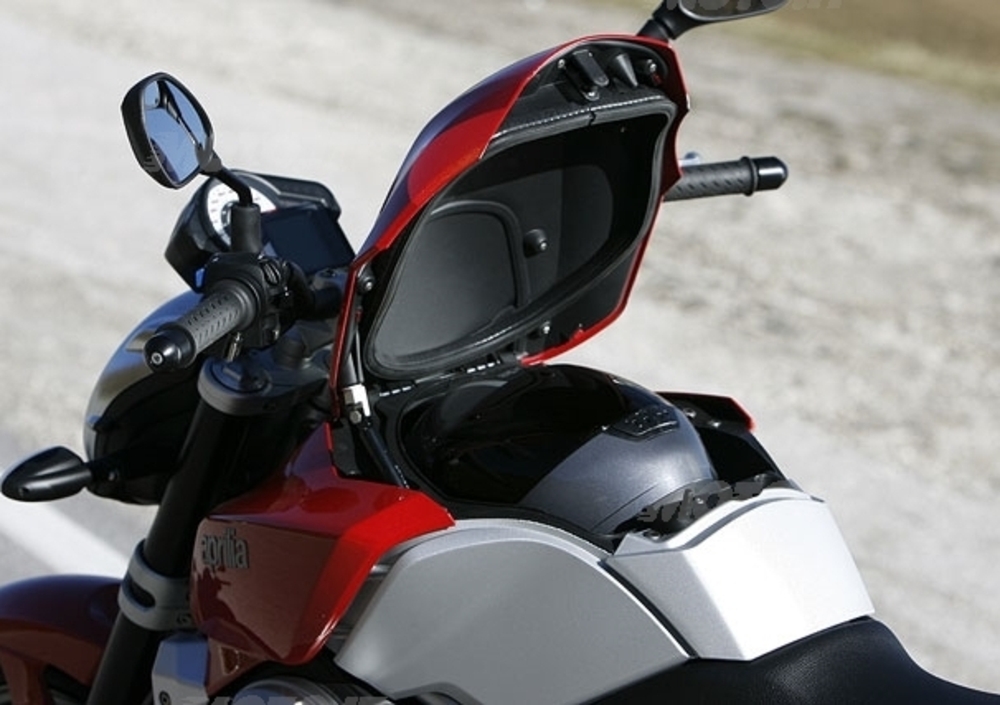Il ¾ anteriore tradisce la somiglianza con una naked varesina dal gruppo ottico decisamente …uguale, mentre il laterale spigoloso e dai volumi compatti risulta più personale. Causa la presenza di un serbatoio della benzina da 19 litri, il codino non è slanciato nei volumi al posto del serbatoio tradizionale, troviamo invece un ampio vano porta-casco. Tale spazio merita un paio di righe di descrizione: si apre grazie allo sblocco elettrico con un pulsante sul blocchetto sx (nel caso in cui non ci fosse batteria nel sottosella troviamo anche uno sblocco meccanico), è dotato di una presa 12v con relativo porta cellulare ed illuminazione, è quindi pratico oltre che capiente visto che può ospitare un casco integrale di tg xl.