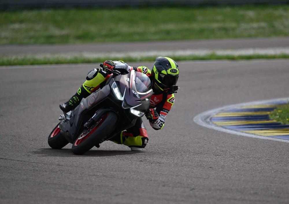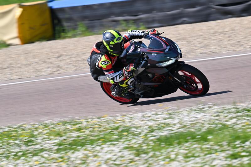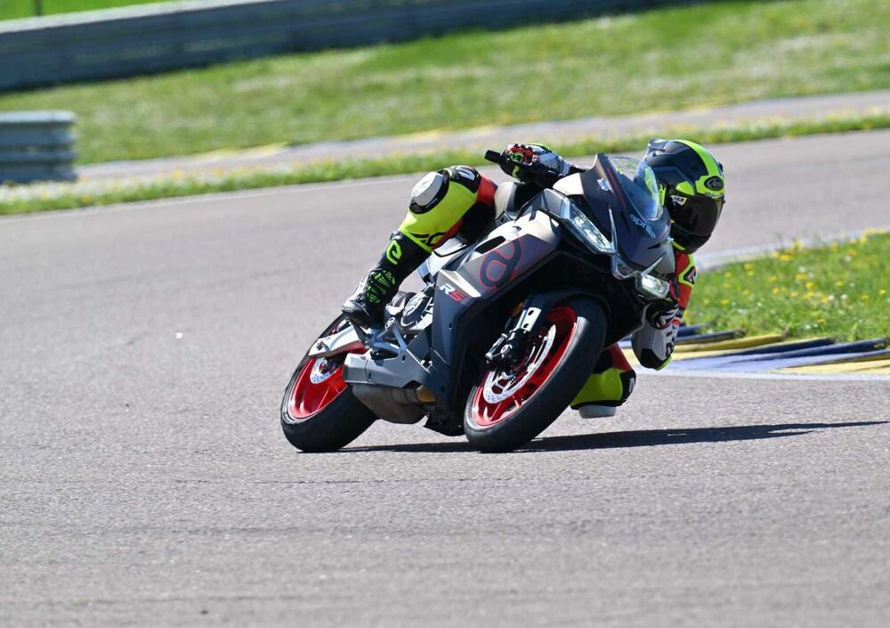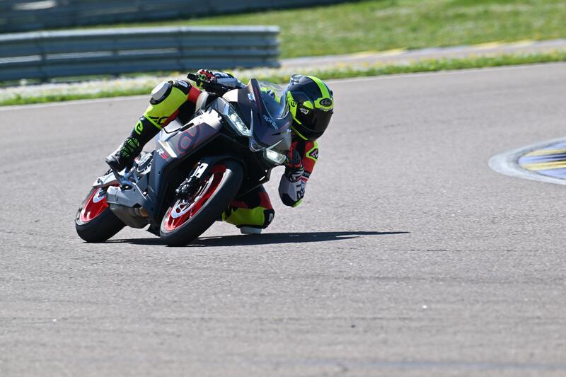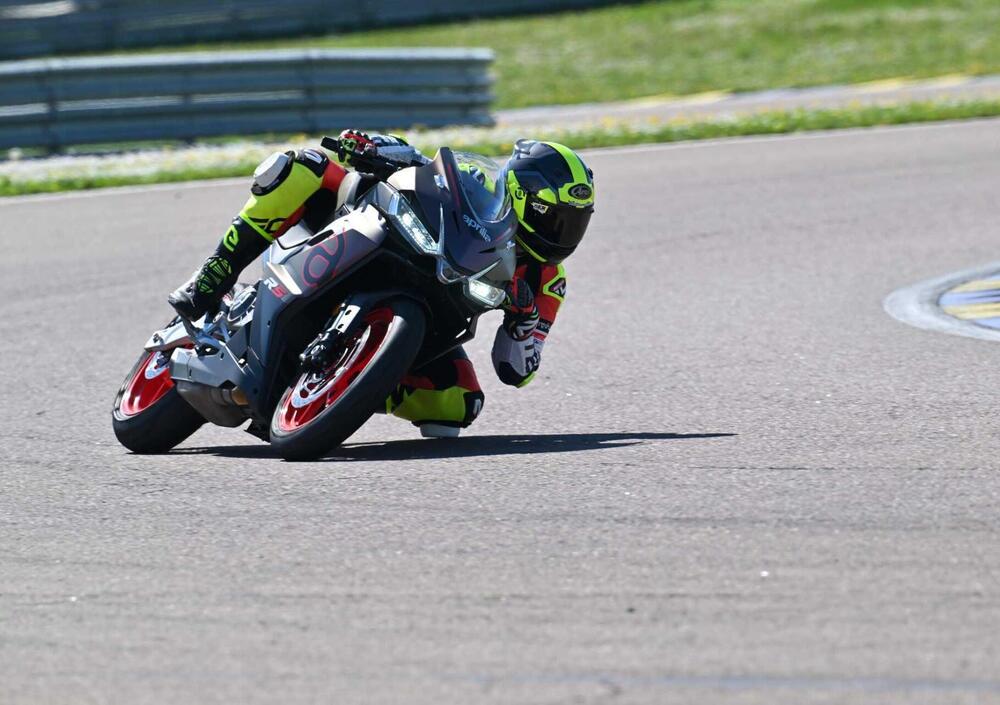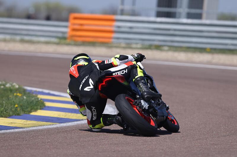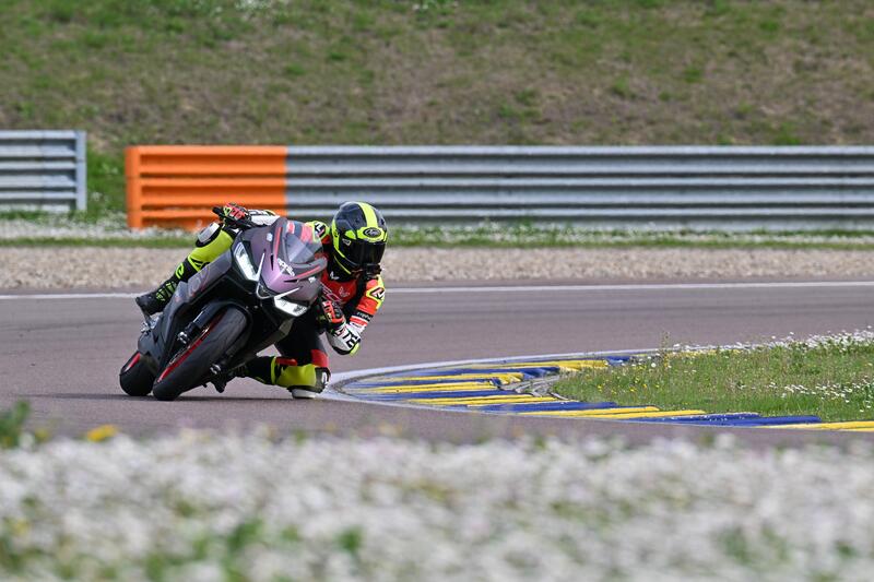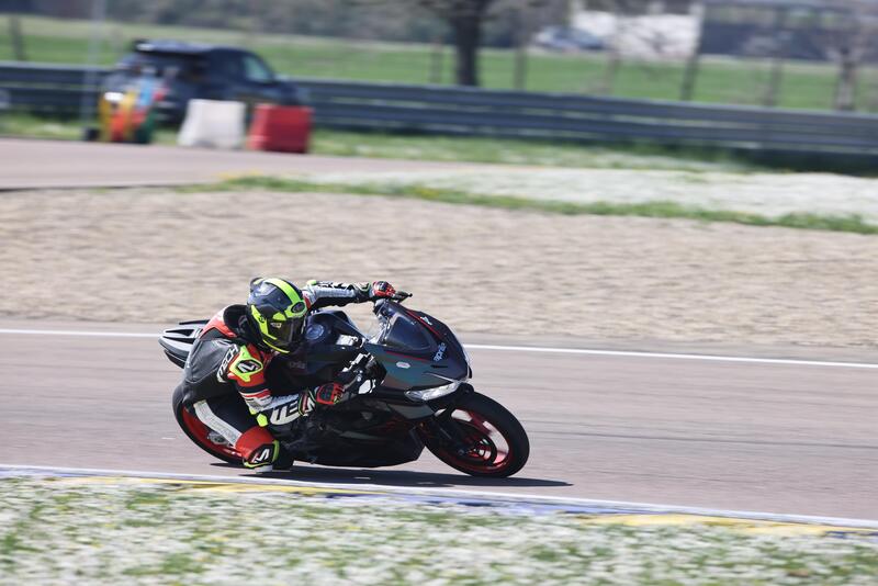 Le RS 457 che abbiamo testato a Modena erano equipaggiate con dei pneumatici Pirelli Supercorsa SP, differenti dai pneumatici della dotazione di serie ma sicuramente più adatti al contesto sportivo in cui abbiamo testato la moto.