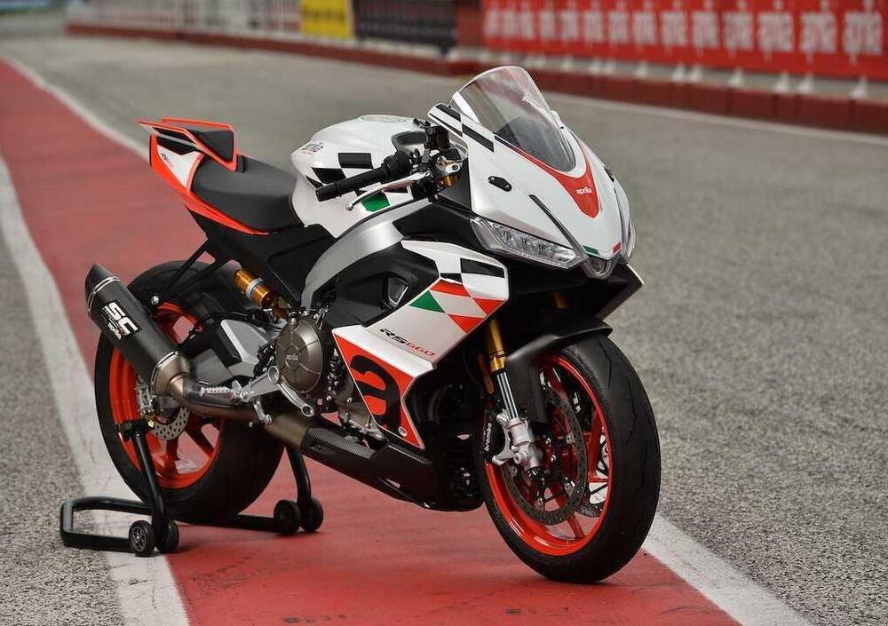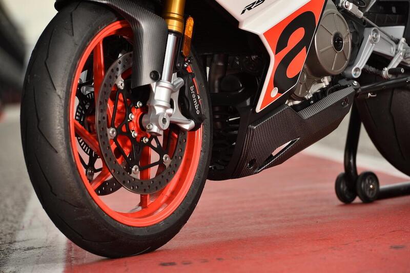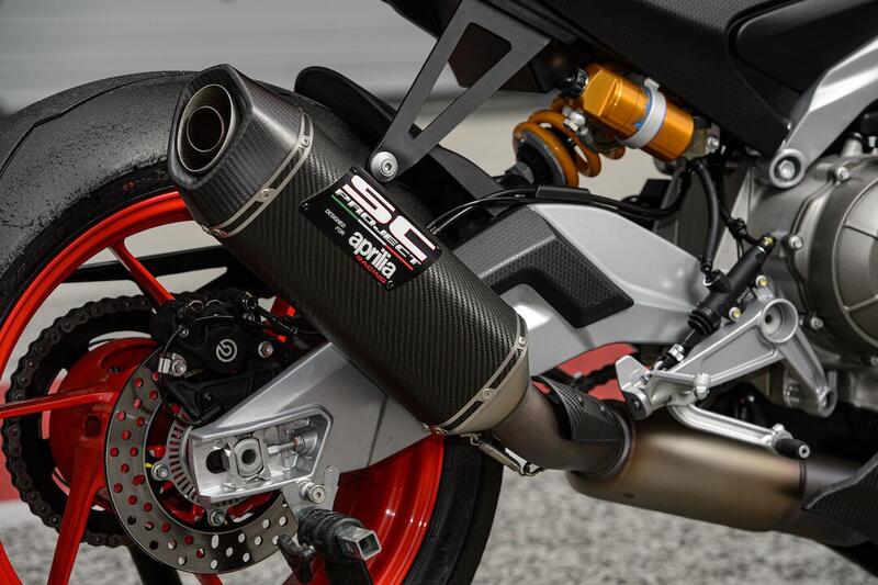 Parafango e puntale in fibra di carbonio, codino monoposto e scarico SC-Project (partner Aprilia in MotoGP), fanno la loro bella figura esteticamente, oltre a far perdere tre chilogrammi di peso, che da 183 passa a 180 kg in ordine di marcia.