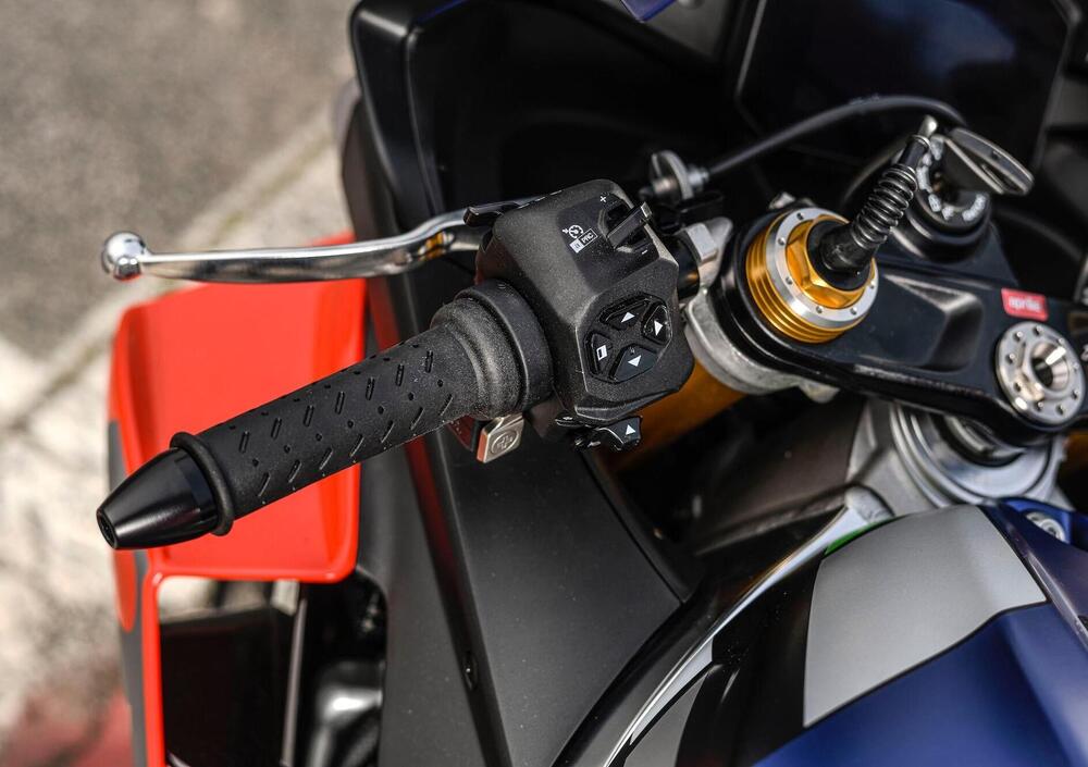 Il nuovo cruscotto TFT da 5” con pannello bonding che limita i riflessi viene gestito da un inedito blocchetto elettrico (più semplice e razionale) e permette di scegliere fra cinque riding mode per l’uso stradale (Street, Sport e tre User personalizzabili) e tre per la pista (Race e i personalizzabili Track1 e Track2) con due diverse visualizzazioni delle informazioni. Naturalmente, il sistema sospensioni semiattive è dotato dell’interfaccia OBTI (Objective-Based Tuning Interface) sempre gestibile dal cruscotto, che se integrato con la piattaforma/app Aprilia MIA può fornire anche indicazioni sulla navigazione.
