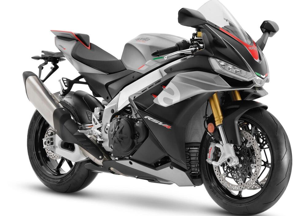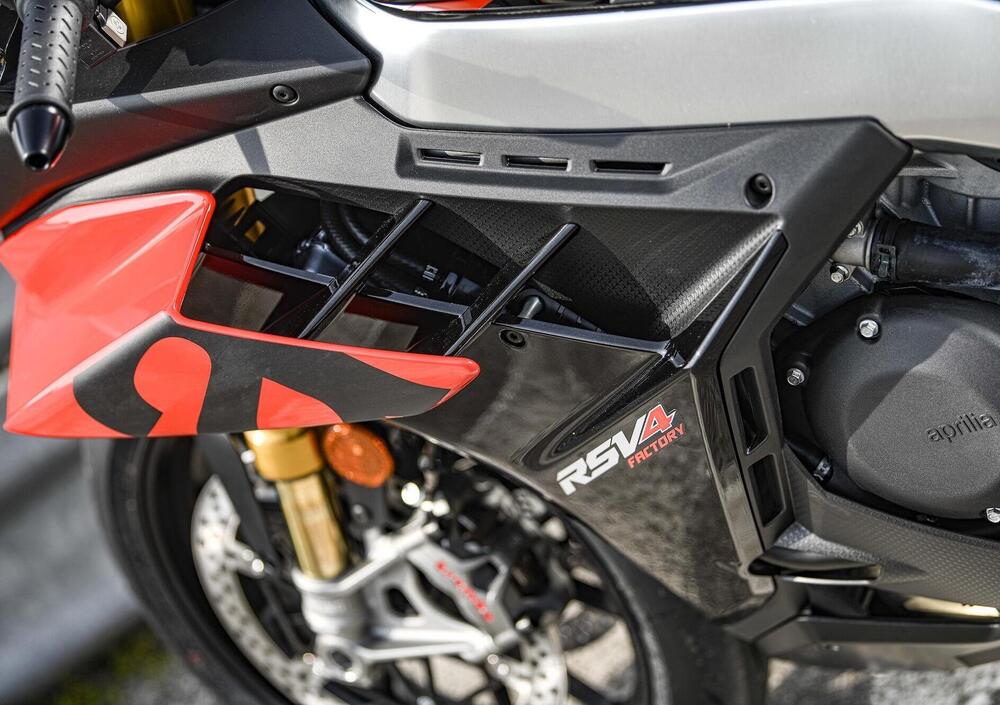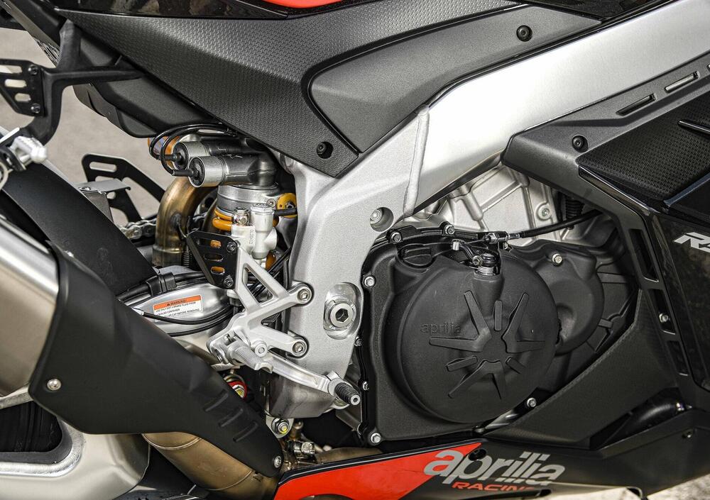 Nessuna variazione per il comparto sospensioni e quello freni, con equipaggiamento rispettivamente Öhlins Smart EC 2.0 con componenti NIX/TTX e Brembo Stylema. Il peso in ordine di marcia si attesta a 199 kg che diventano 202 con il pieno: tre chili più della RSV4 precedente, che però usciva da Noale dotata di diverse parti in carbonio e soprattutto di scarico in titanio…