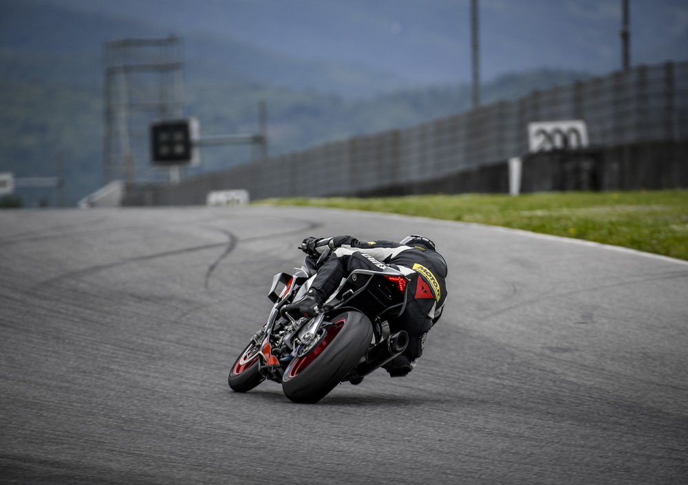 Quello che invece appare immediatamente evidente è il marcato cambio di voce del V4 Aprilia, che già in configurazione di serie è dotato di uno dei rumori di scarico più gustosi del segmento. Ma oltre a una colonna sonora da salivazione compulsiva, il contributo dell’impianto completo Akrapovic si percepisce quasi subito, sotto forma di un’erogazione che, libera delle pastoie dell’Euro-4, diventa regolarissima e con una “schiena” da fare paura. La spinta è pulita e regolare a qualunque regime, la progressione talmente lineare da far pensare, di primo acchito, ad un motore quasi meno potente.
