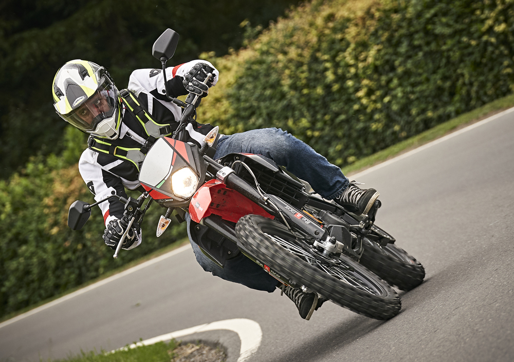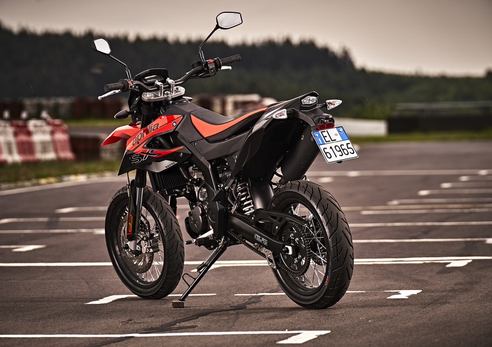 L’impianto frenante prevede dei dischi da 300 mm sulla “SX”, 260 mm per la “RX”, con disegno wave, e da 220 mm posteriore, con pinze flottanti rispettivamente a due e un pistoncino, con tubi in treccia metallica. Da sottolineare che l’impianto è controllato da un sistema ABS Bosch dotato di sistema anti roll-over, che impedisce il sollevamento della ruota posteriore nelle frenate più decise. Il peso dichiarato per entrambe le versioni è di 134 kg con il pieno di benzina.