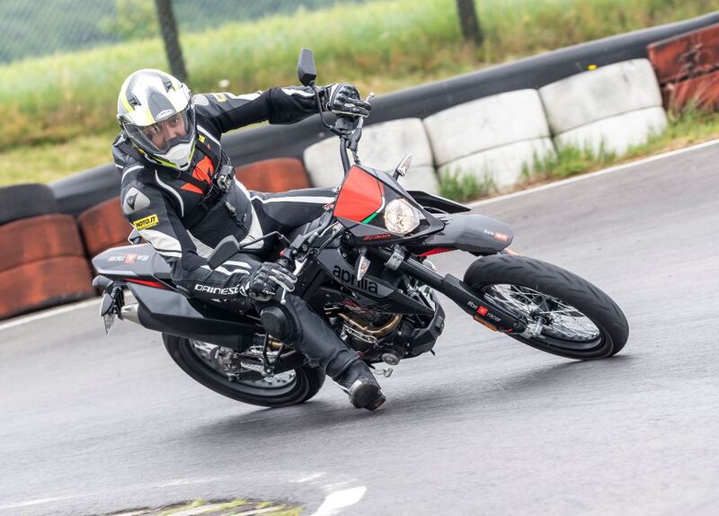 La SX ci fa sorridere sotto al casco integrale, è agilissima con le ruote da 17 pollici, non perde nulla in stabilità e soprattutto permette di prendere confidenza con la guida sportiva. La potenza limitata insegna a sfruttare al meglio l’erogazione, a frenare il meno possibile e a disegnare traiettorie pulite. Poi scatta “l’ignoranza” e allora ci si concede qualche piccolo traverso, tanto per fare coreografia, ma senza esagerare, altrimenti ci si pianta a metà curva e basta. Sorprendenti le gomme CST di primo equipaggiamento, offrono grip in abbondanza, almeno su questo asfalto, e permettono di piegare senza tanti indugi. Poi il meteo si ribella, la pioggia battente ci fa desistere dal continuare a divertirci, anche perché la tutta di pelle zuppa non è il massimo della vita, quindi esce la scritta Game Over.