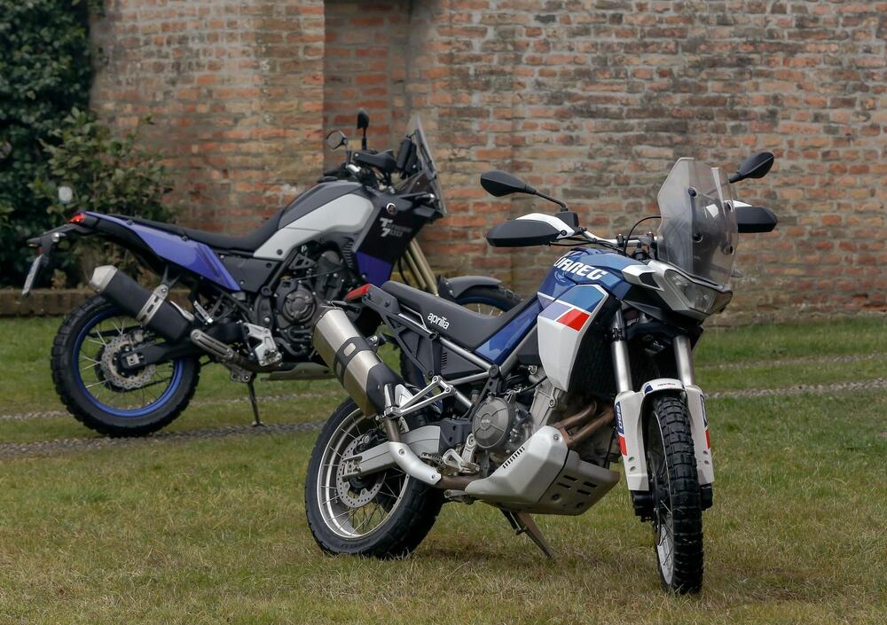 Le due moto del test hanno pesi dichiarati identici (204 kg col pieno), ciclistiche simili (telai in acciaio, sospensioni Kayaba regolabili, freni Brembo, cerchi da 21 e 18”, gomme Pirelli). Persino il medesimo schema motoristico, che elegge il bicilindrico parallelo con fasatura a 270° quale soluzione migliore per costi e ingombri in questo segmento. Cambia un po’ la potenza: 73,5 cavalli Yamaha, 80 Aprilia. E Aprilia ha più escursione dalle sospensioni. Simile anche le capienze dei serbatoi (16 litri Yamaha, 18 Aprilia).