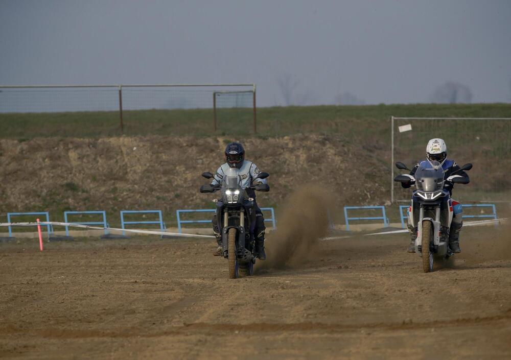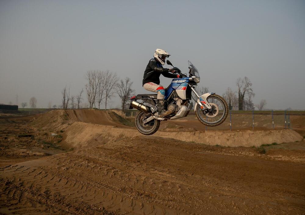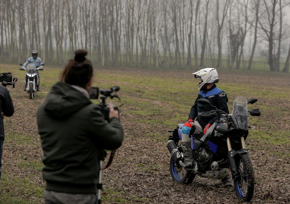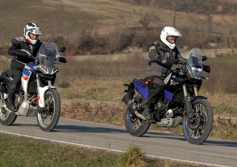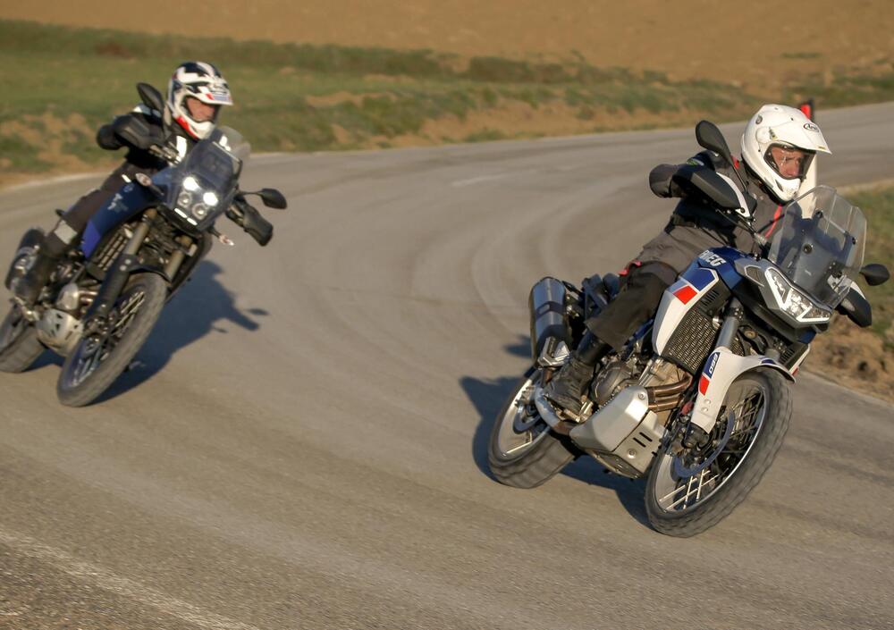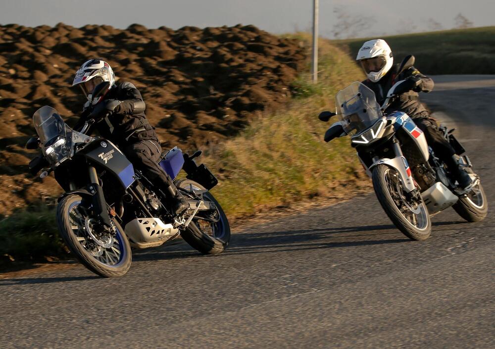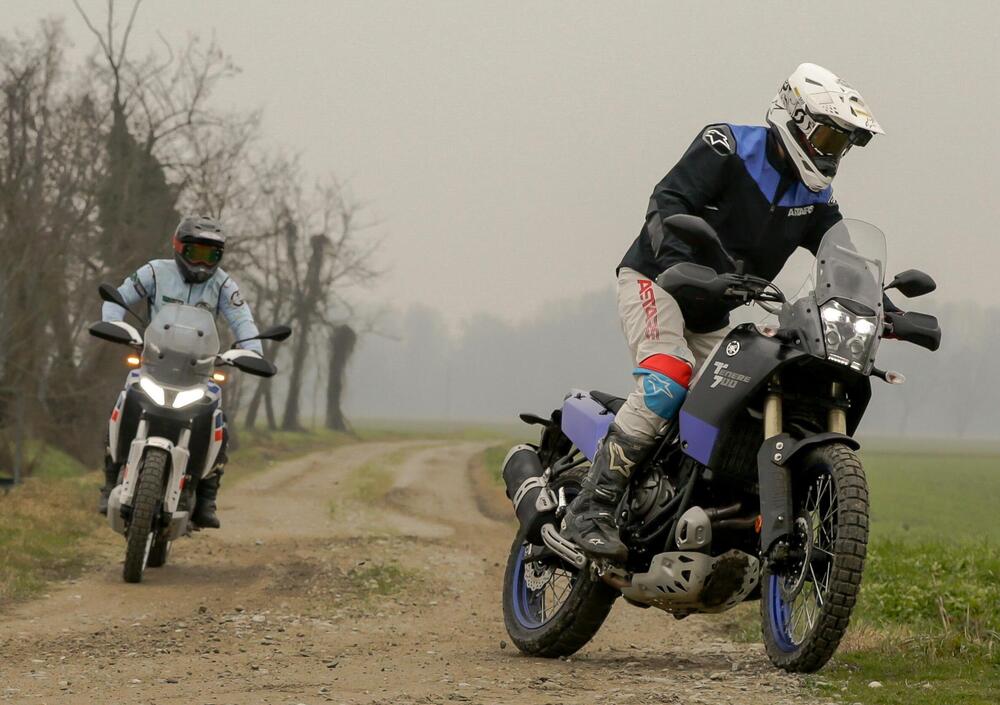 La Yamaha si guida che è un piacere anche su asfalto. È persino meno ballerina di sospensioni e con freni meglio modulabili. Il motore ha dei bei medi e l’allungo che basta per divertirsi. Dopo gli 8.000 giri si avverte la differenza di cavalli, a vantaggio dell’italiana. Con l’asfalto gelido di questi giorni avremmo apprezzato il controllo di trazione. Ottime su entrambe le gomme di primo equipaggiamento (Pirelli Scorpion Rally STR), capaci di passare con rara disinvoltura dalle pieghe sul Penice alla sabbia della pista di Chieve. Abbiamo detto pista? Si passa al fuoristrada! Ma prima vi diciamo come si comportano in autostrada.