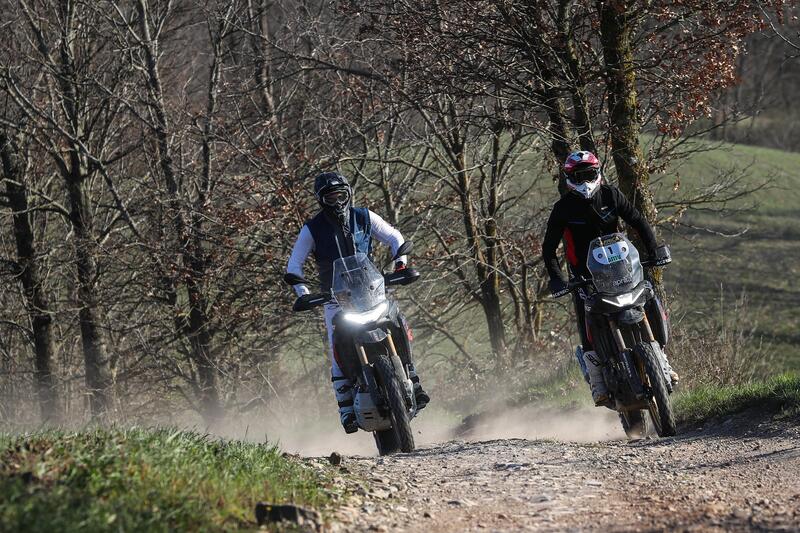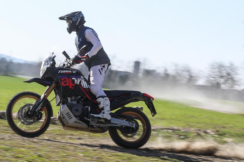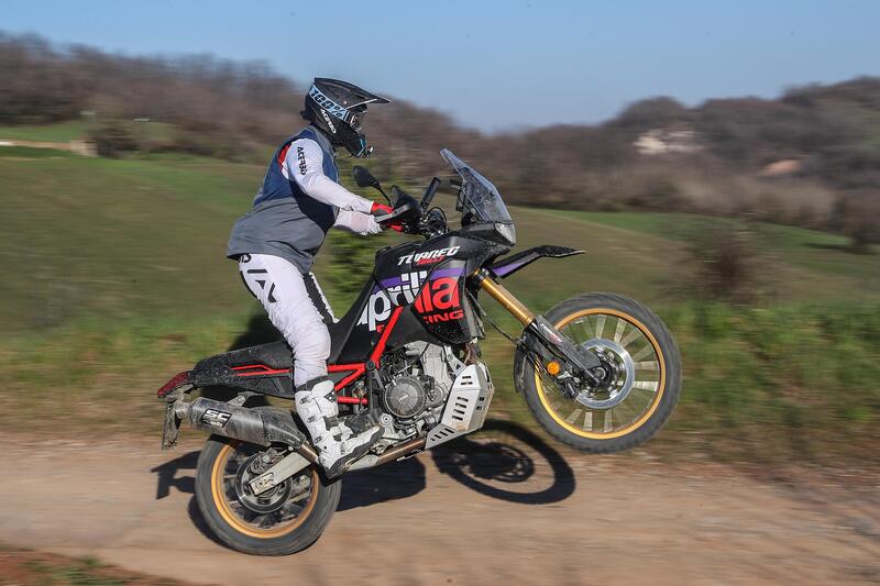 Tutti gli interventi realizzati sul propulsore da parte di Aprilia funzionano bene. La mappa sviluppata nello specifico per l'offroad ha una grande risposta del gas. Appena si ruota il comando il motore c'è, è pronto e scalpitante, proprio quello che serve per superare agilmente gli ostacoli che si possono trovare mentre si fa adventuring, anche quello più tosto. Il bicilindrico 660cc allunga bene anche sull'asfalto, solo a metà tende un po' ad appiattirsi come erogazione. Il suond che esce dallo scarico SC Project è spaziale. Non sembra una marmitta omologata Euro5 + ed invece è proprio così. Tonalità cupa e piena, da vera moto racing.