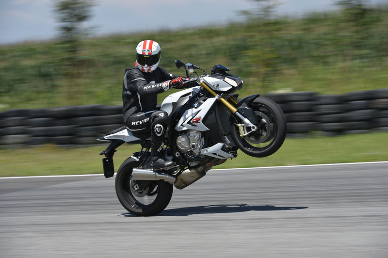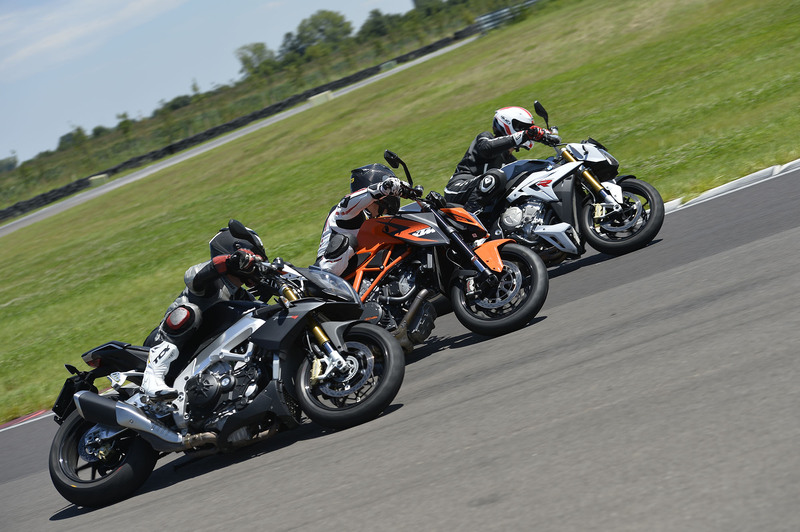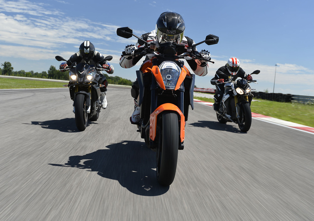Se non fosse per l'Aprilia, la S1000 R sarebbe uscita dal test in pista a testa alta, anche se il confronto con la KTM, in termini di prestazioni, porta a un sostanziale pareggio. La naked tedesca ha tra le sue armi migliori certamente il motore, rabbioso e potente a qualsiasi regime, una stabilità in percorrenza a prova di bomba, ma soffre l'assetto di guida troppo stradale e le pedane basse, con un avantreno leggero e nervoso quando la guida diventa aggressiva. La S1000 R in pieno rettilineo è un missile terra terra, così come si comporta bene in fase di staccata, con l'impianto frenante che seppur brusco in fase iniziale, garantisce decelerazioni a prova di affaticamento, e un inserimento in curva abbastanza rapido. In percorrenza la BMW si comporta bene e rimane stabile fin tanto che non si riprendere in mano il gas. In questo frangente si può sfruttare appieno la buona funzionalità del controllo di trazione, che senza raggiungere la linearità di funzionamento di quello che equipaggia l'Aprilia, permette di aprire il gas senza tanti patemi, ma il fatto di non poter caricare l'avantreno a dovere, a causa delle pedane avanzate e del busto eretto, la rende molto sottosterzante.