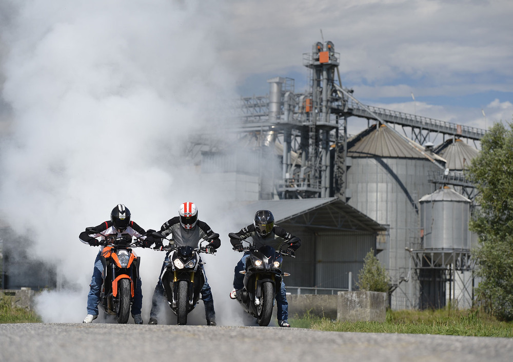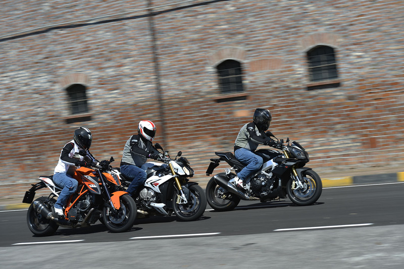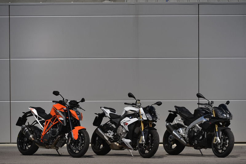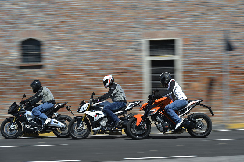 Quattro, quattro, due. Non è né uno schema calcistico e neanche lo schema di un impianto di scarico, sono solo i frazionamenti dei propulsori delle moto protagoniste del test. Quattro cilindri, disposti a V per l’italiana Aprilia Tuono V4, altrettanti cilindri, ma disposti uno accanto all’altro in linea, per la teutonica BMW S 1000 R e “soli” due, ma di dimensioni ciclopiche e disposti anch’essi a V, per l’austriaca KTM 1290 Super Duke R.