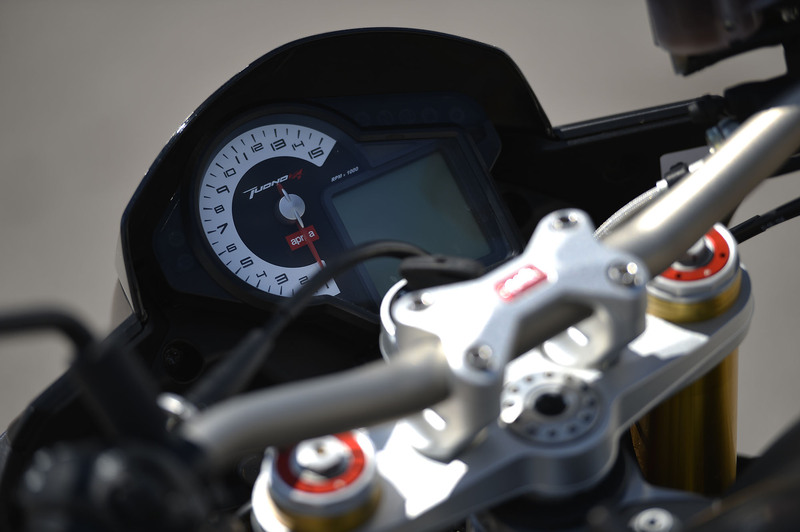 Strumentazione mista per la quattro cilindri di Noale, contagiri analogico e display sul quale si visualizzano innumerevoli informazioni, comprese quelle del completissimo pacchetto elettronico (controllo di trazione aTC – cambio elettronico aQS – Launch control aLC – anti impennata aWC), totalmente personalizzabile e selezionabili attraverso un comando al manubrio. Considerando la tipologia di moto non manca nulla, inoltre è possibile scegliere tra due schermate differenti del display, Road e Race.
