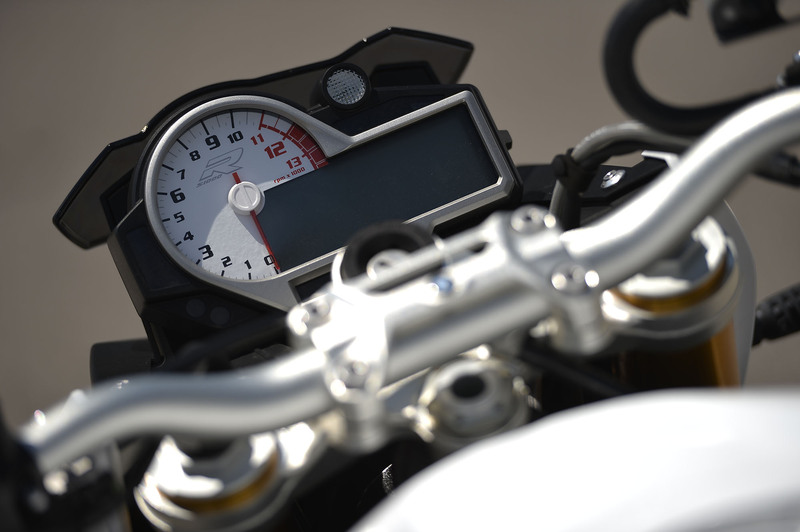 La roadster bavarese pur essendo più giovane della Tuono, le assomiglia parecchio, e distinguerle a colpo d’occhio, può portare i meno attenti a confonderle. Meno male che escludendo la colorazione Light White, le altre due disponibili, Frozen Dark Blue Metallic e Racing Red, rendono la tedesca più riconoscibile. La derivazione S 1000 RR è lampante, rimane il caratteristico gruppo ottico con fari asimmetrici, anche se declinato in maniera diversa, mentre il resto della scarsa carenatura, è specifico per la S1000 R. Le finiture sono un gradino sopra quelle della “RR”, in virtù del fatto che la quattro cilindri BMW in versione naked perde le orribili plastiche non verniciate montate sulla “RR”, mentre si nota una maggiore cura nelle finiture del telaio doppio trave in alluminio e relativo forcellone, e negli accoppiamenti delle plastiche. Purtroppo rimangono le leve al manubrio di fattura criticabile e il serbatoio dell’olio freni, con “tubone” di gomma, entrambi di difficile digestione, soprattutto perché in bella vista proprio davanti al pilota.