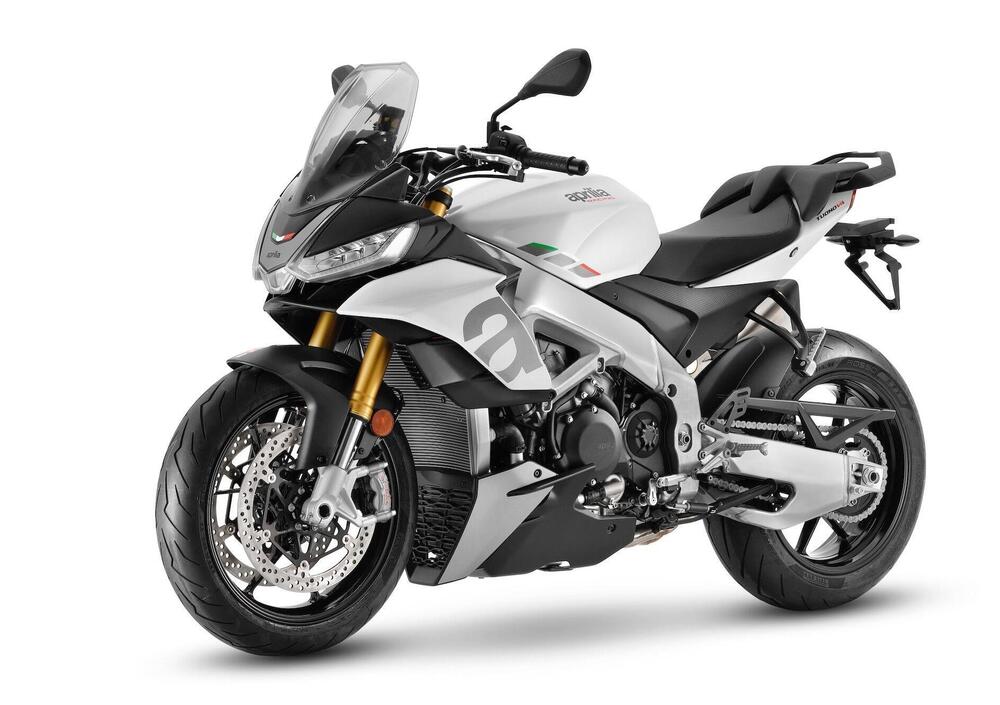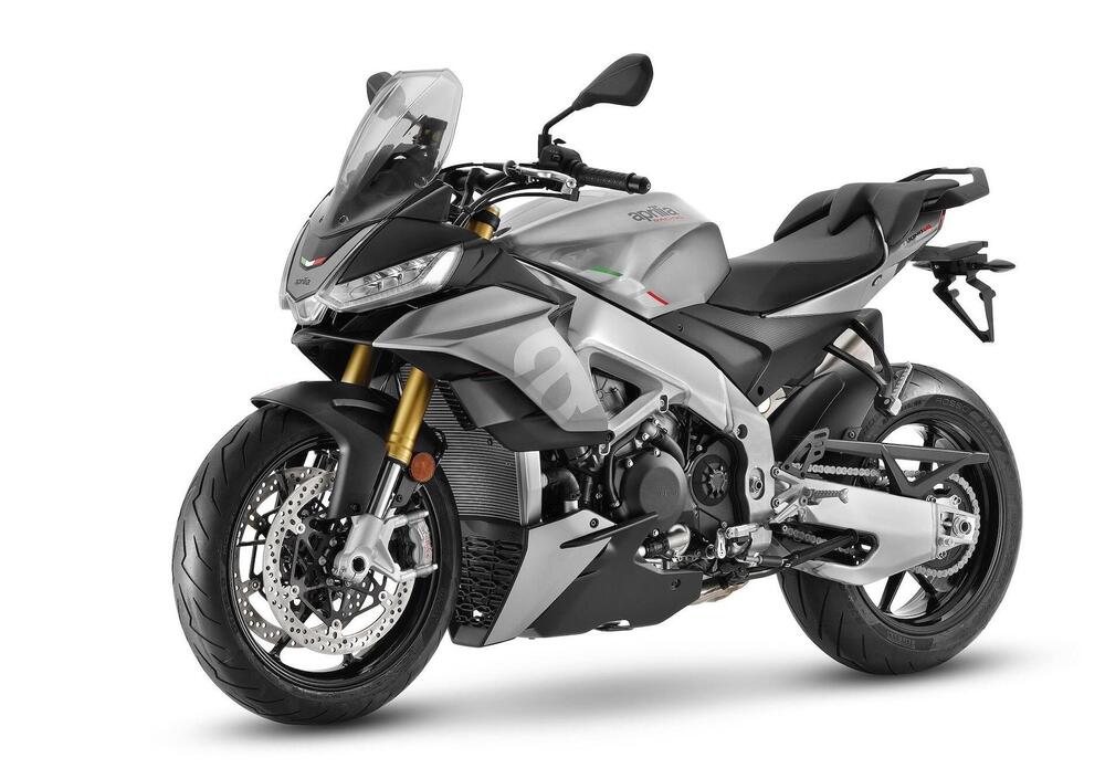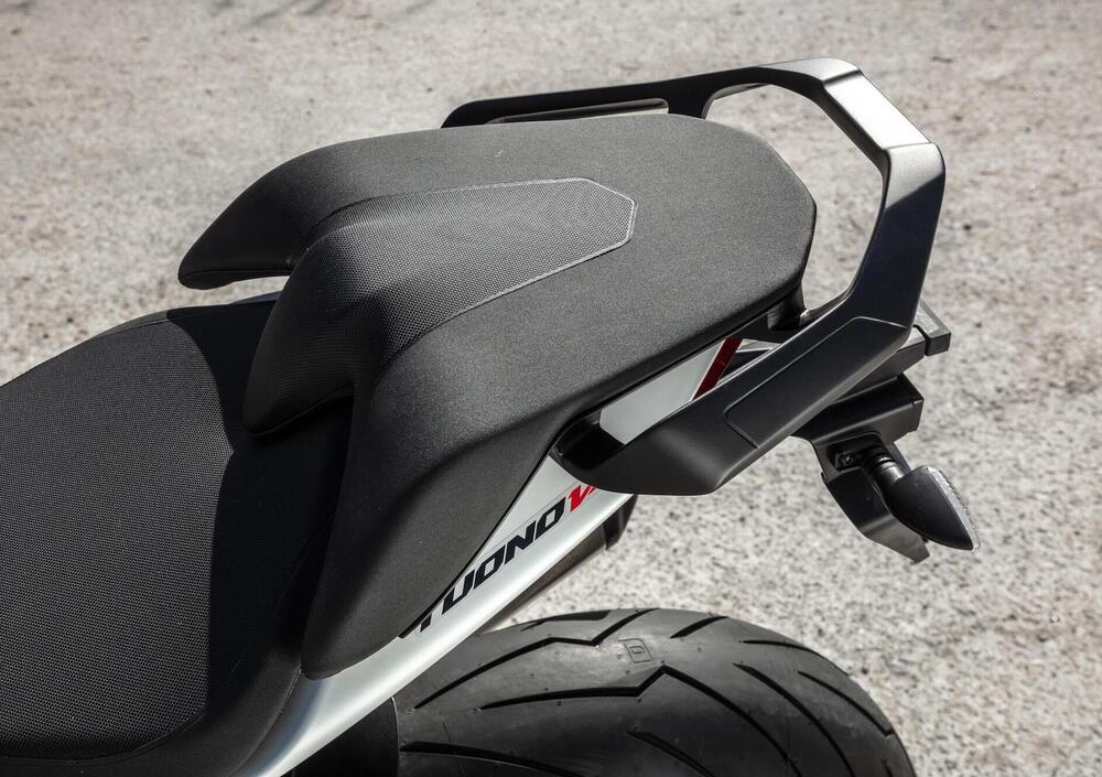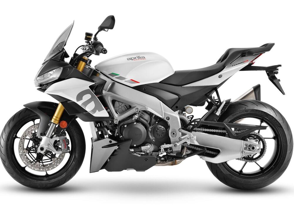 Come nella versione precedente, infatti, la Tuono V4 base offre una miglior sistemazione al passeggero grazie a una sella più ampia (e pedane leggermente più basse) e fa risparmiare qualcosa grazie alla rinuncia alle sospensioni semiattive Öhlins Smart EC in favore di una combinazione Sachs meccanica con forcella rovesciata a regolazione completa separata sui due steli da 43 mm e monoammortizzatore completamente regolabile con serbatoio di compensazione in configurazione piggyback.