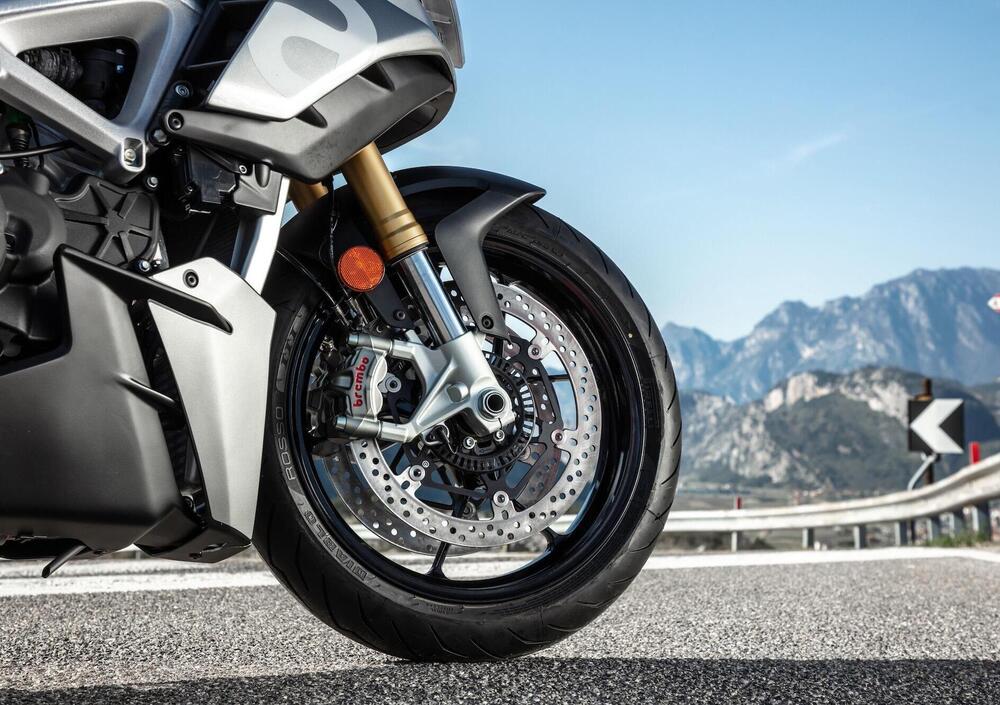 Coerenti nella guida sportiva, relativamente confortevoli quando si preferisce un passo disimpegnato, forcella e mono sono lodevolmente omogenei nella taratura, caratterizzati da una buona scorrevolezza e dalla capacità di copiare bene le asperità degli asfalti anche mediamente disastrati. Non siamo chiaramente a livello di una maxienduro, ma ci sono stradali turistiche messe molto peggio. Certo, sarebbe stato meglio avere le meravigliose Öhlins semiattive della Factory, ma il prezzo sarebbe lievitato non poco…